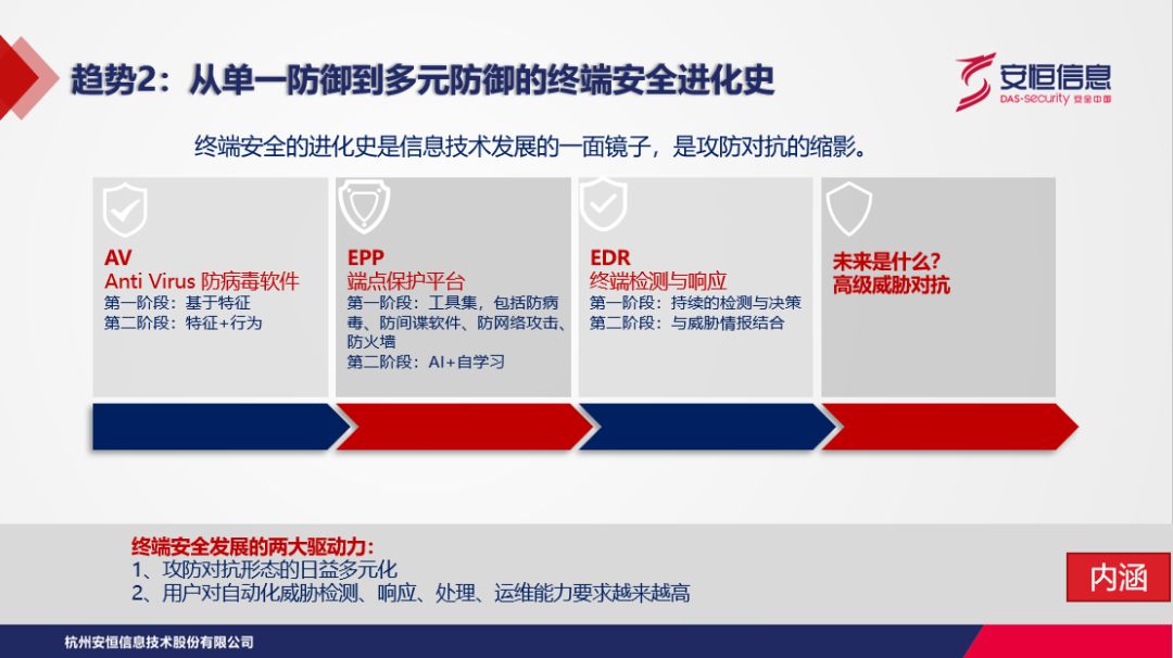 李華生認為,泛終端是未來時代的主流,所有的節(jié)點都將是終端,這也正是統(tǒng)一終端的概念。而對于從單一安全防御到更注重威脅發(fā)現(xiàn)和自動化處置能力,對自動化威脅檢測、響應、處理、運維能力要求越來越高,跨越多級安全層,關(guān)聯(lián)分析各層安全設(shè)備的威脅數(shù)據(jù),是解決新一代終端安全的關(guān)鍵。