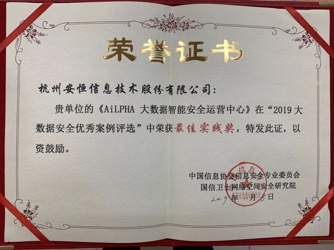 安恒信息AiLPHA大數(shù)據(jù)智能安全運營中心榮獲“最佳實踐獎”。