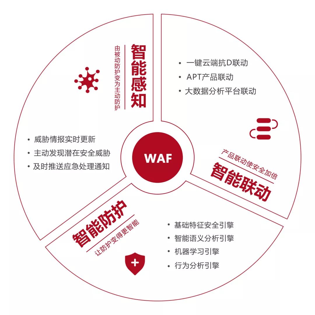 新一代智能WAF通過與“云端抗D中心”、“APT”、“大數(shù)據(jù)分析平臺”的智能聯(lián)動,彌補(bǔ)了單臺WAF安全防護(hù)的局限性,實(shí)現(xiàn)對可疑、未知的攻擊行為檢測,對為客戶提供更加全面的Web應(yīng)用安全解決方案。