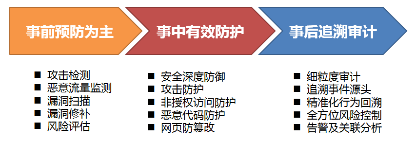 信息安全事件的發(fā)生,通常都會經(jīng)歷事前、事中、事后三個生命周期過程,不同的階段我們可以有針對性地采用安全措施,三個生命周期的安全任務(wù)即事前預(yù)防為主、事中有效防護(hù)、事后追溯審計。
