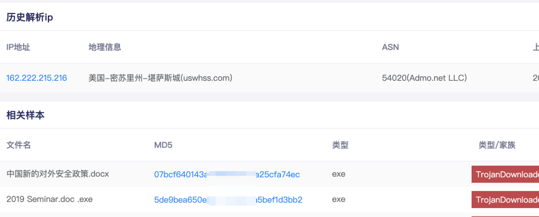 通過安恒文件威脅分析平臺(tái)檢索域名gongzuosousuo[.]net,又發(fā)現(xiàn)多個(gè)樣本,其中2個(gè)樣本引起我們注意: