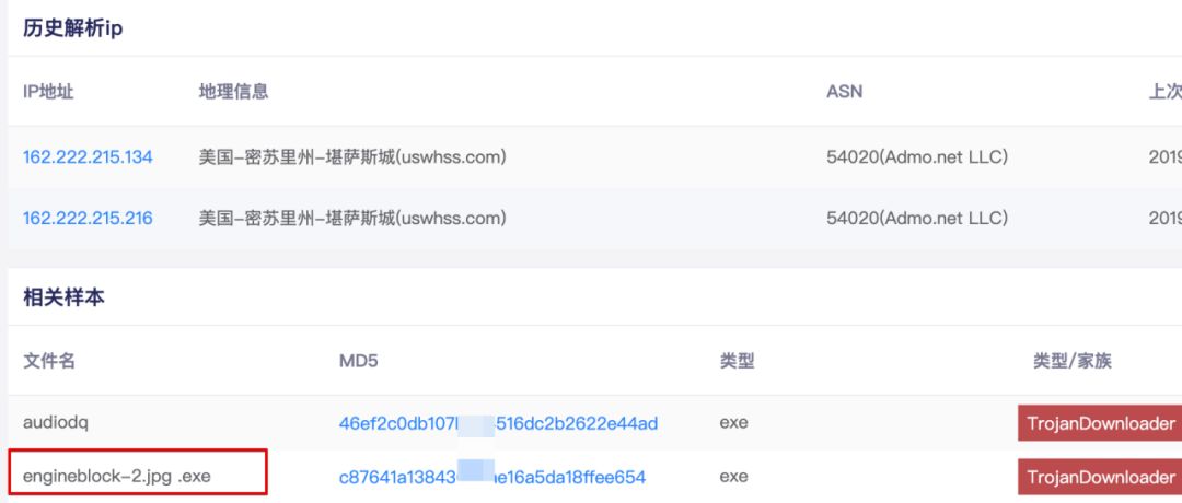 接下來,分析chm文件下載的ausetup.msi文件,它運(yùn)行后也會(huì)釋放叫“audiodq.exe”,其回連地址是:“l(fā)mhostsvc[.]net”,繼續(xù)使用平臺(tái)檢索該域名,發(fā)現(xiàn)叫做engineblock-2.jpg.exe程序