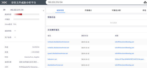 并且通過安恒文件威脅分析平臺(tái)分析關(guān)聯(lián)到另一個(gè)域名zhulidailiren4winnt[.]net也是主模塊回連域名。