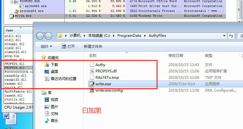 write.exe會(huì)加載同目錄下的PROPSYS.dll實(shí)現(xiàn)白加黑利用