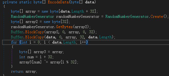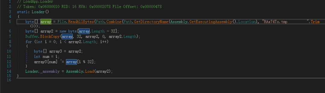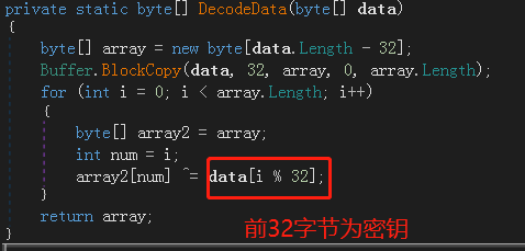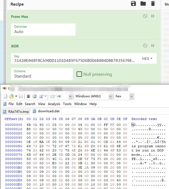 .tmp文件前32字節(jié)為密鑰,后續(xù)字節(jié)通過(guò)異或解密,解密后確為一個(gè)PE格式文件