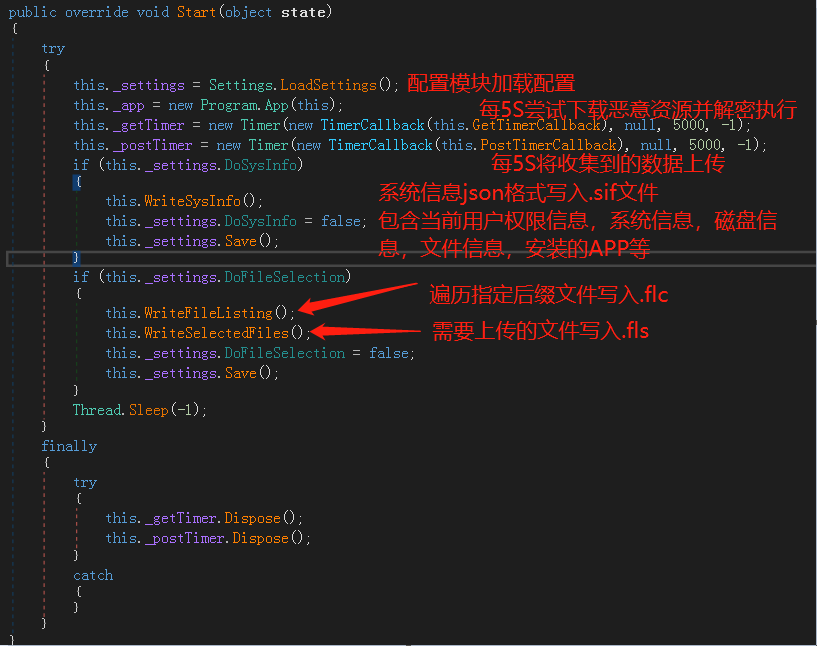 樣本主體是一個(gè)C#竊密木馬,名稱(chēng)SystemApp.dll,竊密木馬整體流程為加載配置、啟動(dòng)信息收集和下載執(zhí)行線程、進(jìn)行一次基本信息收集:
