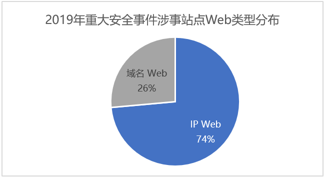 不難發(fā)現(xiàn),在2019年重大安全事件涉事站點(diǎn)Web類型中,有74%的Web資產(chǎn)是通過(guò)IP直接訪問(wèn)的。IP Web資產(chǎn)通過(guò)IP+端口可以直接進(jìn)行訪問(wèn),繞過(guò)了云防護(hù),這類站點(diǎn)更容易被黑客入侵。