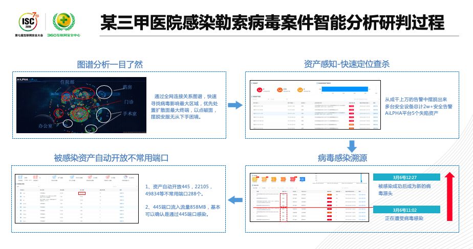 范淵以安恒AiLPHA大數(shù)據(jù)智能平臺處置某三甲醫(yī)院感染勒索病毒導致內(nèi)網(wǎng)大量設備爆發(fā)藍屏現(xiàn)象為例,通過利用安恒AiLPHA大數(shù)據(jù)智能平臺,可迅速洞察事件源頭,了解病毒影響范圍,定位關鍵擴散節(jié)點,還能清楚地查看資產(chǎn)如何一步一步被感染勒索病毒,包括被成功感染時間,被感染端口等信息。