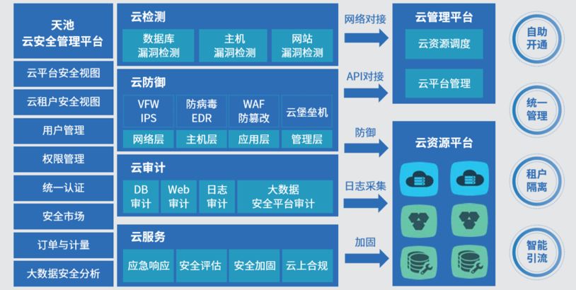 天池云安全管理平臺(以下簡稱 “天池”)可對接兼容國內外主流的云計算平臺,結合安恒全線安全產(chǎn)品、不斷匯聚安全能力,打造云檢測、云防御、云審計、云服務等云安全體系,幫助用戶建設一個統(tǒng)一管理、彈性擴容、按需分配、安全能力完善的云安全資源池。