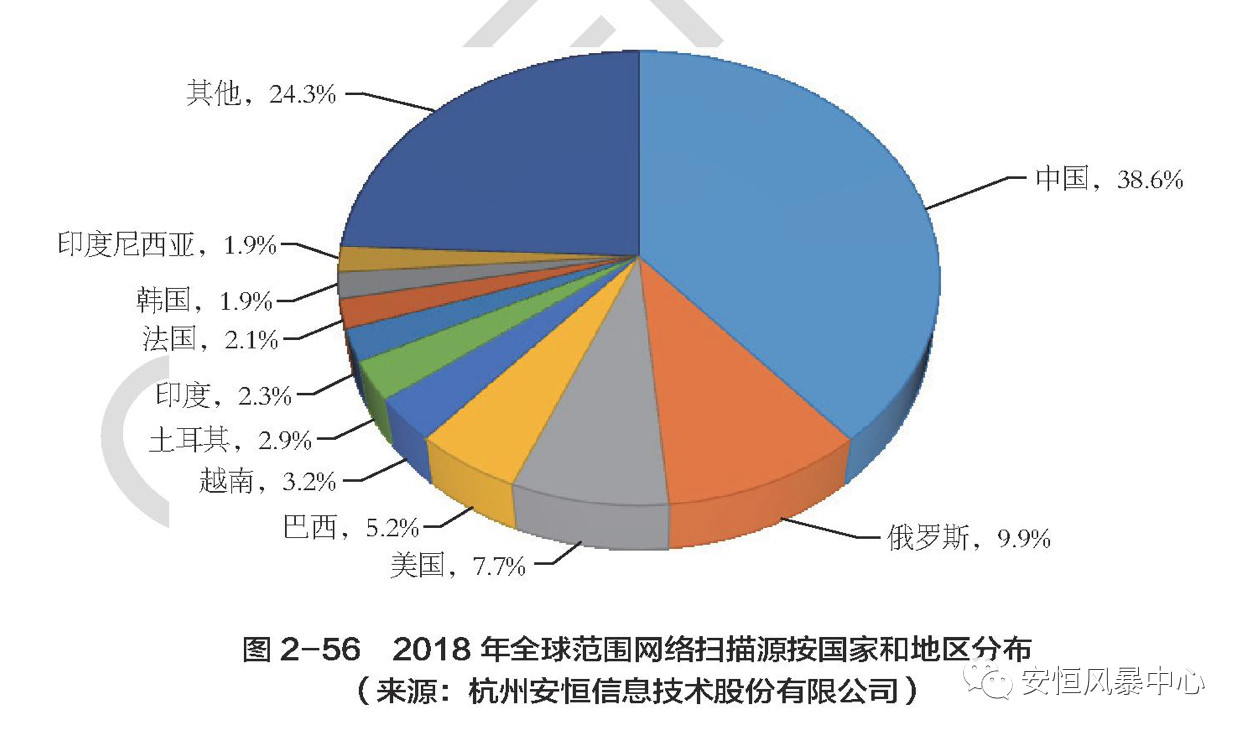 “2018年,杭州安恒信息技術股份有限公司累計發(fā)現掃描源21.3萬個,其中有38.6%的掃描源來自中國,9.9%是從俄羅斯發(fā)起的,美國、巴西、越南緊隨其后,分別是:7.7%、5.2%、3.2%。2018年全球范圍網絡掃描源按國家和地區(qū)分布情況如圖2-56所示?!?/em> 《2018年中國互聯網網絡安全報告》
