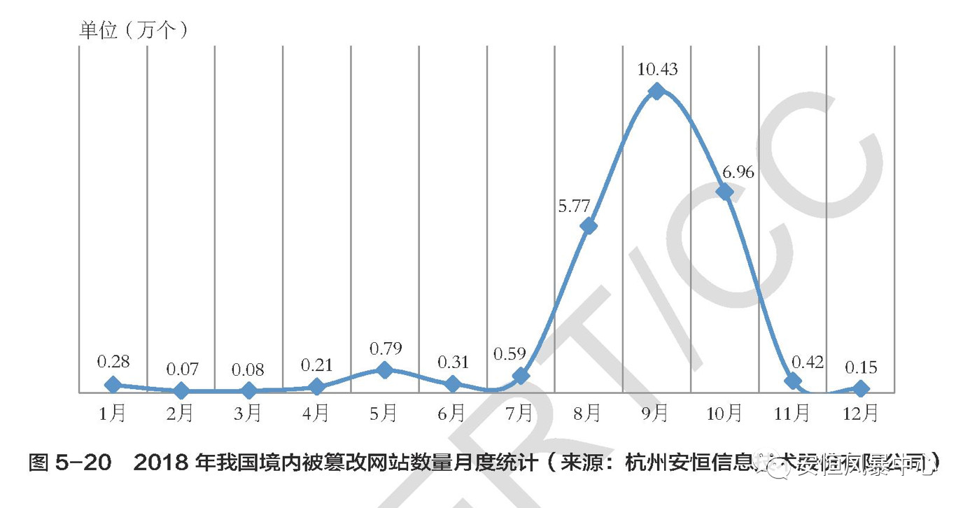 “2018年,杭州安恒信息技術股份有限公司根據客戶要求和實際需求,將全國部分網站加入監(jiān)測平臺,進行對植入暗鏈、植入黑頁、頁面篡改等類型安全事件的遠程監(jiān)測。根據監(jiān)測結果,2018年我國境內被篡改網站總量為255085個。2018年我國境內被篡改網站數量月度統(tǒng)計如圖5-20所示,其中9月達到全年最高值(104323個),主要原因是當月對全國300多萬個重點行業(yè)進行了首頁事件集中監(jiān)測》?!?/em>《2018年中國互聯網網絡安全報告》