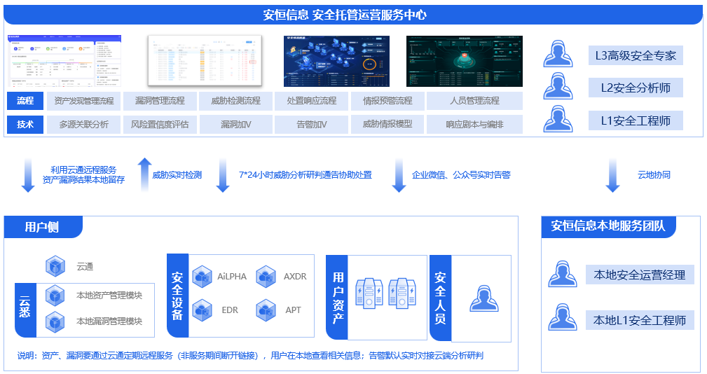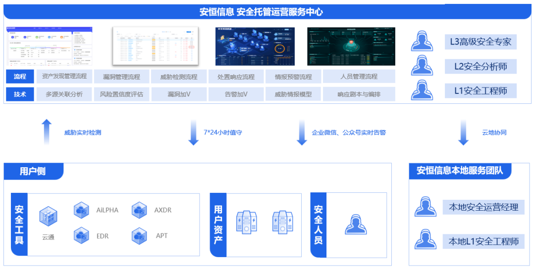 7*24小時在線的云端三級安全運營專家以及分布在全國各城市的本地服務團隊,通過云端托管運營服務平臺實現(xiàn)用戶側安恒邊界、流量、終端設備的托管,并按照資產發(fā)現(xiàn)、暴露面檢測、互聯(lián)網漏洞掃描與管理、威脅實時檢測響應等運營流開展工作。
