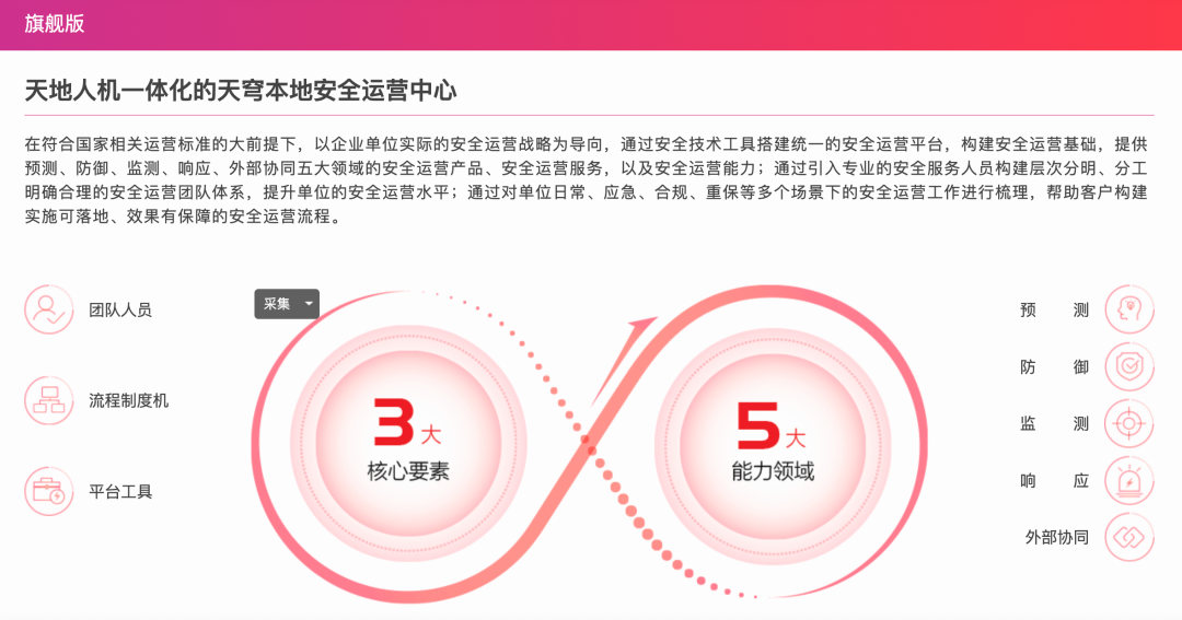 在符合國家相關運營標準的大前提下,以企業(yè)單位實際的安全運營戰(zhàn)略為導向,通過安全技術工具搭建統(tǒng)一的安全運營平臺,構建安全運營基礎,提供預測、防御、監(jiān)測、響應、外部協(xié)同五大領域的安全運營產品、安全運營服務,以及安全運營能力;通過引入專業(yè)的安全服務人員構建層次分明、分工明確合理的安全運營團隊體系,提升單位的安全運營水平;通過對單位日常、應急、合規(guī)、重保等多個場景下的安全運營工作進行梳理,幫助用戶構建實施可落地、效果有保障的安全運營流程。