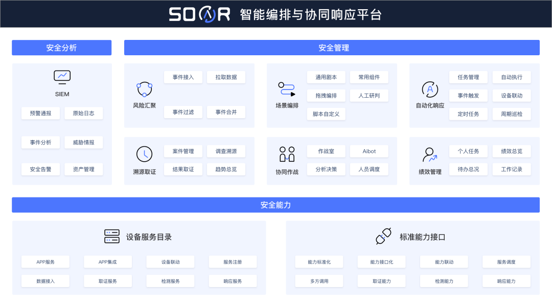 安恒信息AiLPHA安全編排與協(xié)同響應(yīng)管理平臺榮獲“2021-2022年優(yōu)秀創(chuàng)新軟件產(chǎn)品”,該平臺基于SOAR給出了安全運營解決之道,以DASCA安全能力中心進行統(tǒng)一抽調(diào)標準化,多種安全能力為基礎(chǔ)構(gòu)建安全能力中臺。