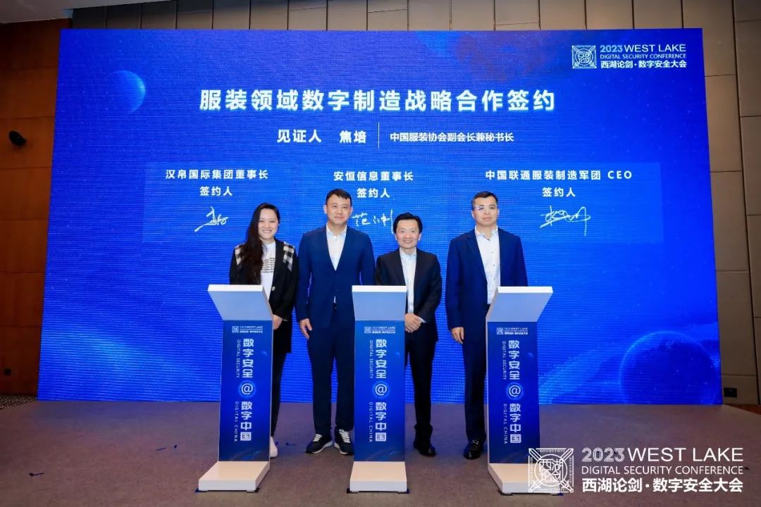 近日,在中國服裝協(xié)會(huì)副會(huì)長兼秘書長焦培見證下,漢帛國際集團(tuán)總裁高敏、安恒信息董事長范淵、中國聯(lián)通服裝制造軍團(tuán)CEO樊偉簽署合作協(xié)議。未來多方將攜手在服裝行業(yè)數(shù)字化轉(zhuǎn)型的安全建設(shè)等方面開展深入的合作,打造服裝產(chǎn)業(yè)數(shù)字化轉(zhuǎn)型中的網(wǎng)絡(luò)和數(shù)據(jù)安全建設(shè)樣板,用創(chuàng)新技術(shù)以及前沿戰(zhàn)略為行業(yè)高質(zhì)量發(fā)展保駕護(hù)航。