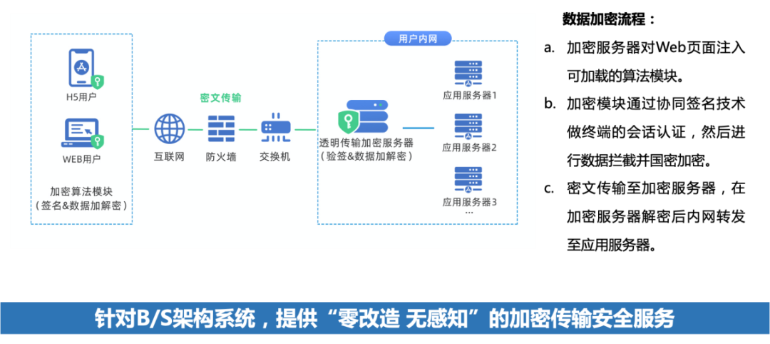 傳輸透明加密系統(tǒng)聚焦于解決用戶業(yè)務(wù)數(shù)據(jù)在網(wǎng)絡(luò)傳輸中潛在的被竊取和篡改風(fēng)險(xiǎn),采用國密SM1、SM2、SM3、SM4密碼算法,對Web應(yīng)用進(jìn)行數(shù)據(jù)透明加密,并實(shí)現(xiàn)應(yīng)用系統(tǒng)“零改造”對接。
