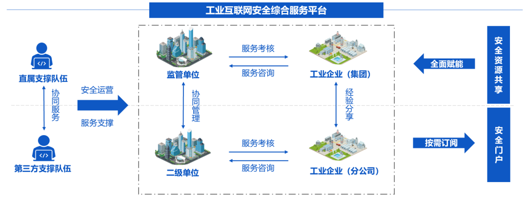 建立主管部門(mén)與工業(yè)企業(yè)的安全服務(wù)溝通橋梁,組建省、市\(zhòng)工業(yè)園區(qū)綜合安全公共服務(wù)資源池,引導(dǎo)工業(yè)企業(yè)自主選擇相關(guān)服務(wù),實(shí)現(xiàn)快速“對(duì)癥下藥”;提供安全知識(shí)共享服務(wù)社區(qū),分享安全防護(hù)管理與技術(shù)經(jīng)驗(yàn),形成形成面向主管部門(mén)和工業(yè)企業(yè)的雙向賦能服務(wù)機(jī)制。