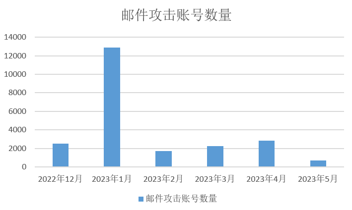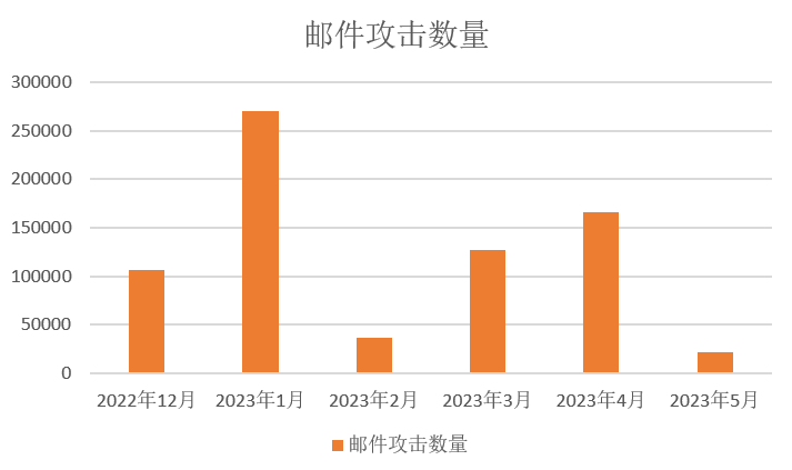 2022年12月至2023年5月期間,安恒信息云監(jiān)測(cè)平臺(tái)監(jiān)測(cè)到郵件攻擊超60萬次,這部分的攻擊是繞過了郵件安全網(wǎng)關(guān)并最終到達(dá)用戶郵件文件夾的郵件數(shù)量,即最終受影響的數(shù)量。