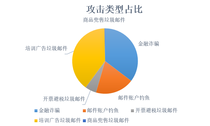 從惡意郵件類型分析,培訓(xùn)類廣告投遞和金融詐騙為主,分別占比39%和35%,其次是盜號(hào)釣魚類,占比19%,所以可以得出結(jié)論,惡意郵件攻擊以牟利為主要目的,如圖4所示。