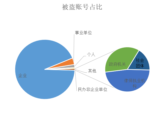 不法分子郵件攻擊賬號(hào)的來源可能自己搭建節(jié)點(diǎn),也可能是通過盜號(hào)的方式獲取的原本正常的賬號(hào)。選取其中可以識(shí)別到單位的攻擊賬號(hào),可以清楚的發(fā)現(xiàn)企業(yè)是賬號(hào)被盜的重災(zāi)區(qū),被盜賬號(hào)占比高達(dá)93.4%,其次部分的事業(yè)單位也存在對(duì)應(yīng)的風(fēng)險(xiǎn),約占整體被盜賬號(hào)的3.6%,再就是個(gè)人的郵箱賬號(hào)占比1.7%,如圖5所示。