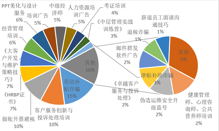 攻擊者以牟利為主要的目的,通常會(huì)實(shí)施培訓(xùn)廣告和金融詐騙兩種類型的郵件攻擊。針對(duì)郵件的主題進(jìn)行分析后,發(fā)現(xiàn)《關(guān)于發(fā)放員工補(bǔ)助(補(bǔ)貼)福利通知》、《個(gè)人勞動(dòng)(補(bǔ)貼))已下發(fā),請(qǐng)查看下圖查收》這類勞動(dòng)補(bǔ)貼類的詐騙郵件占比高達(dá)15%,其次是各類培訓(xùn),以企業(yè)經(jīng)營管理類培訓(xùn)為主,包含客服類、經(jīng)營管理類、人力資源、銷售類、 財(cái)務(wù)避稅等針對(duì)企業(yè)的各類培訓(xùn),整體高達(dá)40%,也有PPT美化,中級(jí)經(jīng)濟(jì)師等各類針對(duì)個(gè)人的培訓(xùn)約占20%。同時(shí)也會(huì)有開票避稅這類黑灰色產(chǎn)業(yè)信息,也有直接賣郵件群發(fā)軟件這類工具的郵件,如圖7所示。
