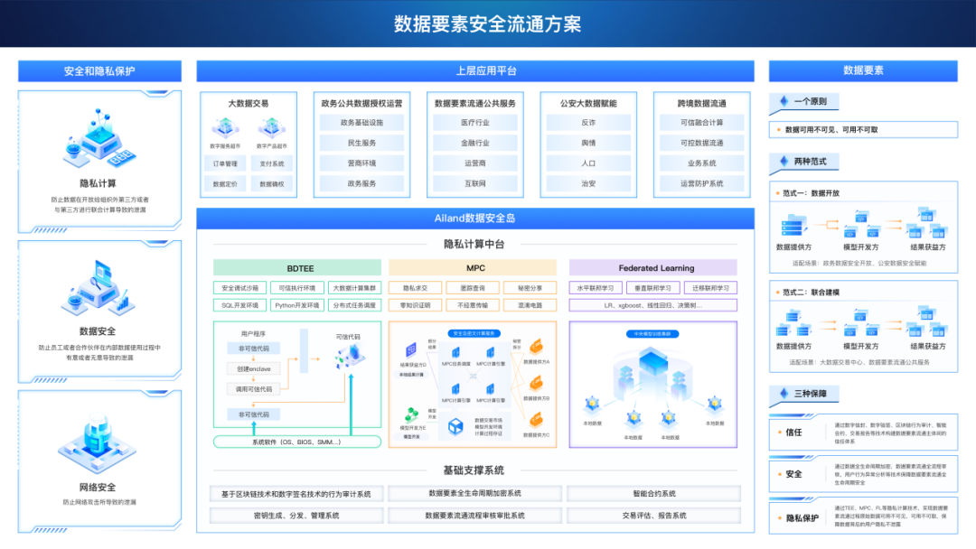針對數(shù)據(jù)加密場景,安恒信息推出以傳輸透明加密、數(shù)據(jù)庫透明存儲加密產(chǎn)品為主的數(shù)據(jù)透明加密解決方案?;谏逃妹艽a技術對傳輸環(huán)節(jié)的動態(tài)數(shù)據(jù)及存儲環(huán)節(jié)的靜態(tài)數(shù)據(jù)進行加密,在保障數(shù)據(jù)安全性的同時,將對用戶業(yè)務的影響降到最低。針對數(shù)據(jù)可信流通場景,安恒信息通過商用密碼與可信執(zhí)行環(huán)境、安全多方計算、聯(lián)邦學習等隱私計算相關技術相結(jié)合,實現(xiàn)共享數(shù)據(jù)的所有權(quán)和使用權(quán)分離,確保原始數(shù)據(jù)的“可用不可見”、“可用不可取”,保障多方數(shù)據(jù)聯(lián)合計算過程的可靠、可控和可溯。