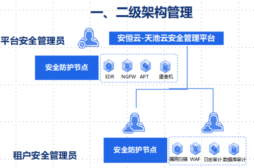 天翼云科技有限公司云南分公司“一城一池”云安全能力建設(shè)項目在天翼云平臺側(cè)部署了一套云安全管理平臺和安全資源池,為云平臺側(cè)提供終端安全、運維審計、漏洞掃描、日志審計、數(shù)據(jù)庫審計等安全能力;在租戶側(cè)亦部署了一套云安全管理平臺和安全資源池,為租戶側(cè)提供VPN、數(shù)據(jù)庫審計、防火墻、Web應(yīng)用防護、主機安全、日志審計、運維審計、APT威脅監(jiān)測等安全能力。云平臺和租戶可自助開通30余種SaaS化云安全能力,實現(xiàn)安全能力服務(wù)化。同時,平臺側(cè)的云安全管理平臺作為一級管理平臺,納管位于租戶側(cè)的二級云安全管理平臺。租戶可自主維護安全資源池的安全能力,或者將安全資源池的安全能力托管給天翼云公司。