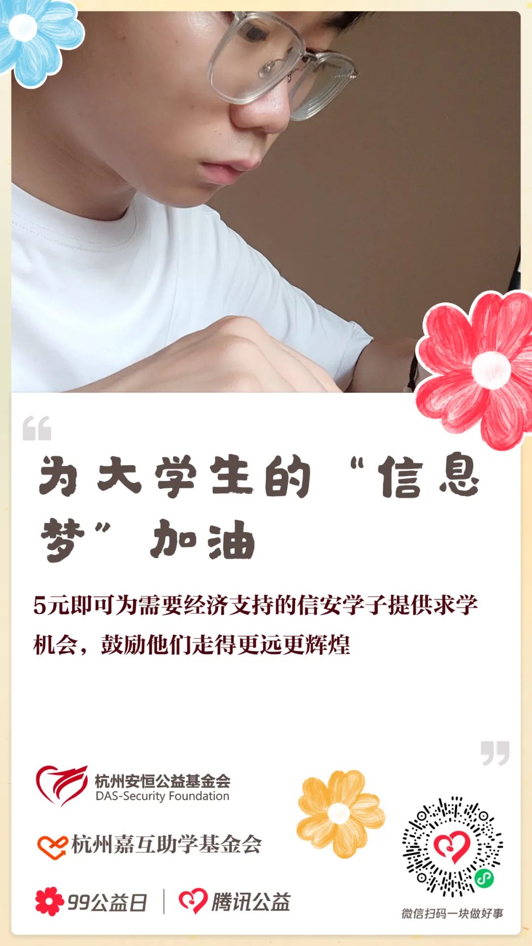99公益日是由騰訊公益發(fā)起的目前國內(nèi)影響最大的、參與人數(shù)最多的全民公益盛事之一。正逢99公益日九周年之際,安恒公益基金會首次參與99公益活動,與杭州嘉互助學基金會、騰訊公益聯(lián)合開展“恒愛筑夢 星火勵學”,為需要經(jīng)濟支持的信安學子提供求學機會,鼓勵他們走得更遠更輝煌。而安恒公益基金會的步伐遠不止于此,從往昔走來,更邁向未來。