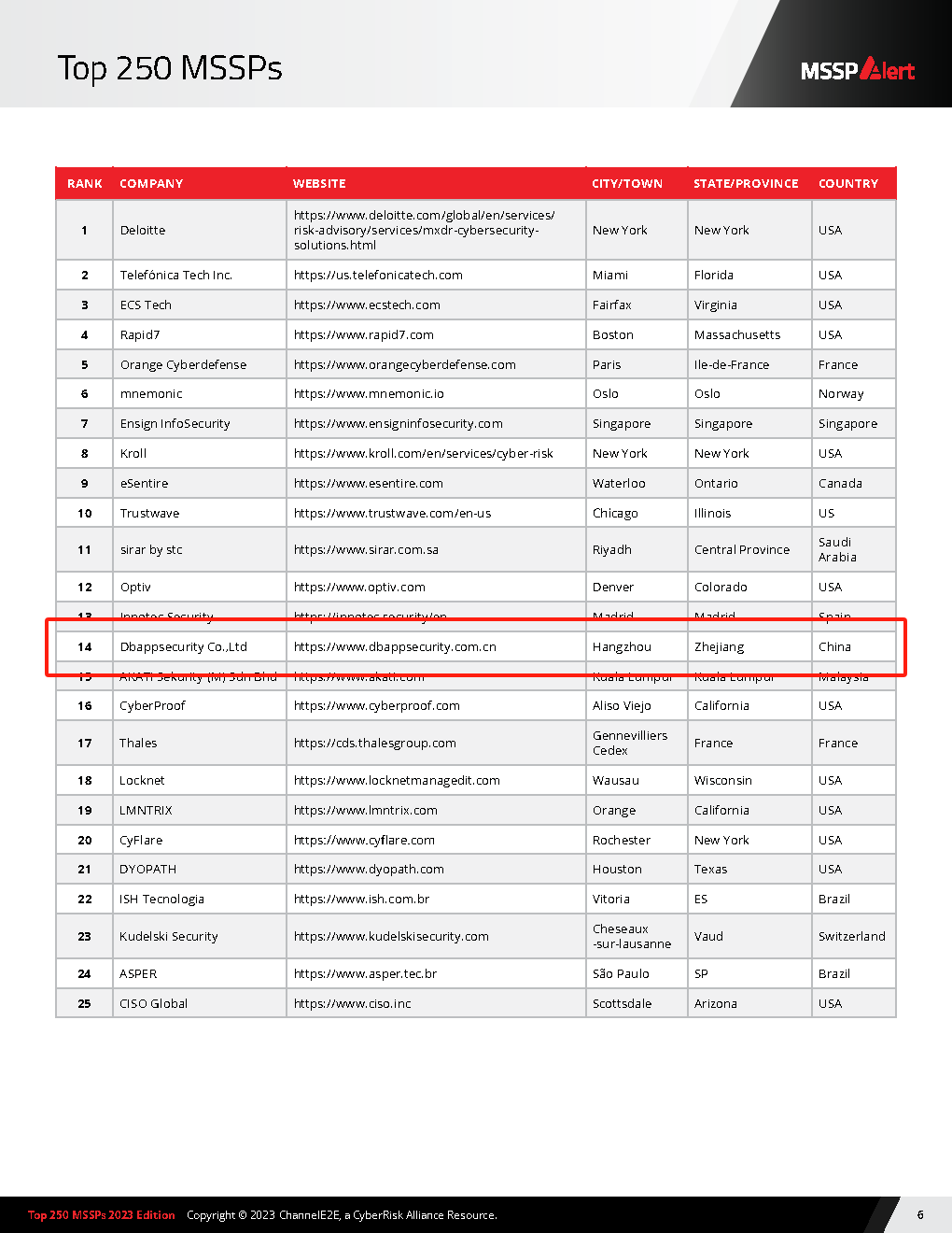 安恒信息榮登「2023年MSSPs TOP250報(bào)告」全球榜單