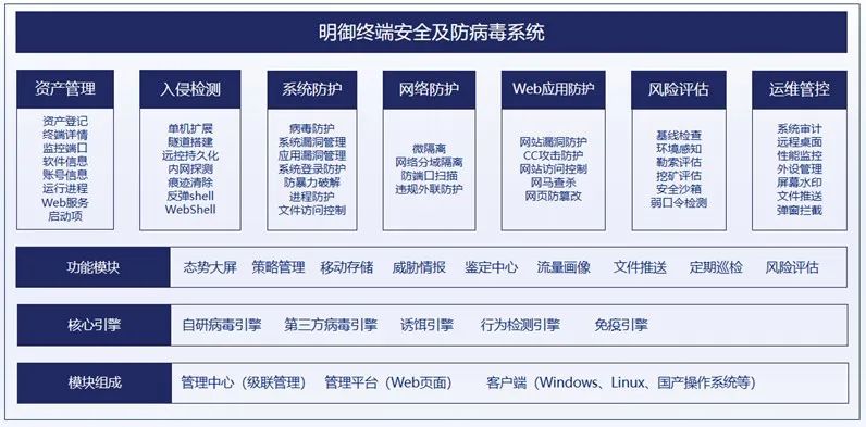 明御終端安全級(jí)防病毒系統(tǒng)是一款集成了豐富的系統(tǒng)加固與防護(hù)、網(wǎng)絡(luò)加固與防護(hù)等功能的主機(jī)安全產(chǎn)品。目前該產(chǎn)品廣泛應(yīng)用在服務(wù)器、桌面PC、虛擬機(jī)、工控系統(tǒng)、容器安全、攻防對(duì)抗等各個(gè)場(chǎng)景。