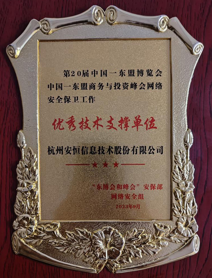 在為期四天的中國(guó)—東盟博覽會(huì)、峰會(huì)中,安恒信息網(wǎng)絡(luò)安保團(tuán)隊(duì)在網(wǎng)絡(luò)安全主管部門的統(tǒng)籌指導(dǎo)下,7X24小時(shí)現(xiàn)場(chǎng)值守,對(duì)安全事件及時(shí)響應(yīng)、實(shí)時(shí)分析、有效處理,圓滿完成了此次網(wǎng)絡(luò)安保任務(wù),被授予了“優(yōu)秀技術(shù)支撐單位”的榮譽(yù)。