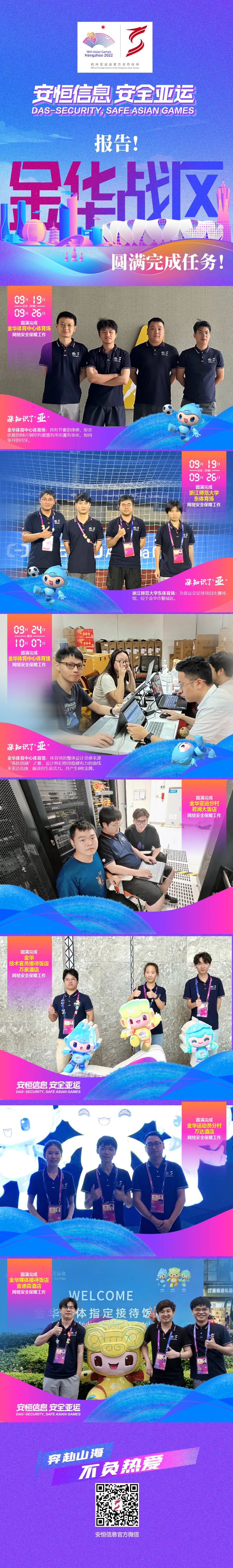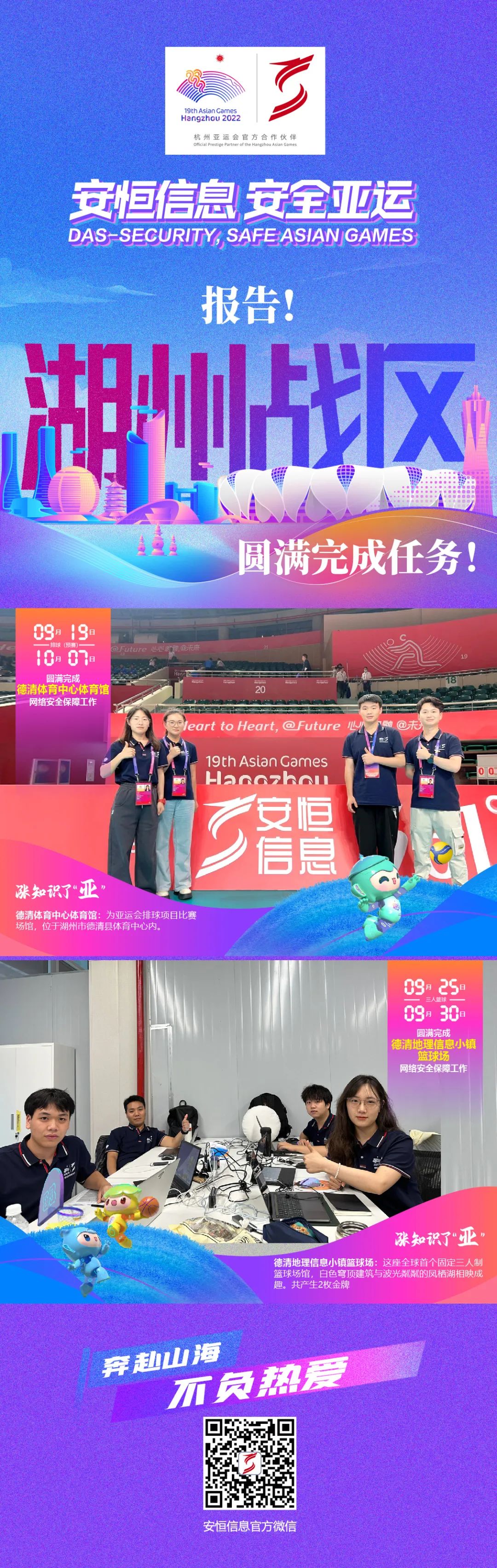隨著本屆亞運(yùn)會(huì)步入尾聲,安恒信息六大主戰(zhàn)區(qū)中,繼溫州、寧波之后,金華、紹興、湖州三大主戰(zhàn)區(qū)也陸續(xù)完成網(wǎng)絡(luò)安全保障任務(wù),畫上圓滿句點(diǎn)。至此,除即將舉辦閉幕式的主辦城市杭州外,其余五大戰(zhàn)區(qū)已全面告捷!