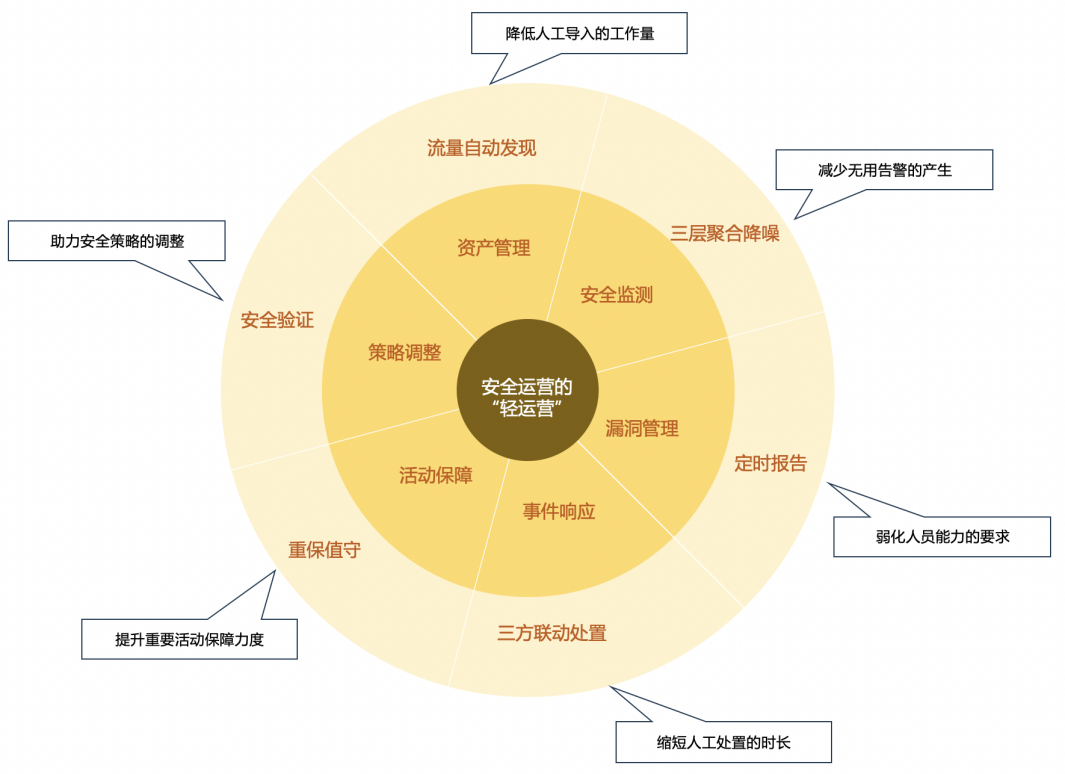 對(duì)于“輕運(yùn)營(yíng)”定義,可以這樣理解:“輕運(yùn)營(yíng)”是以資產(chǎn)為核心,基于安全運(yùn)營(yíng)平臺(tái),建立一套實(shí)時(shí)的資產(chǎn)風(fēng)險(xiǎn)模型,實(shí)現(xiàn)自動(dòng)化或半自動(dòng)化事件風(fēng)險(xiǎn)分析、預(yù)警和處置閉環(huán)的集中安全管理體系。其中關(guān)鍵點(diǎn)有兩個(gè):1)自動(dòng)化或半自動(dòng)化;2)流程要閉環(huán)處置。在世界范圍,尤其在中國(guó),中小企業(yè)、醫(yī)院、高校等單位還是占大多數(shù),而這些單位信息化運(yùn)營(yíng)人員都少之又少,更何況安全運(yùn)營(yíng)人員?如果有一套安全產(chǎn)品能幫助企業(yè)摸清家底、度量安全水平、自動(dòng)化或半自動(dòng)化的閉環(huán)處置掉當(dāng)天的事件,做到“今日事,今日畢”,那無(wú)疑是有價(jià)值的。