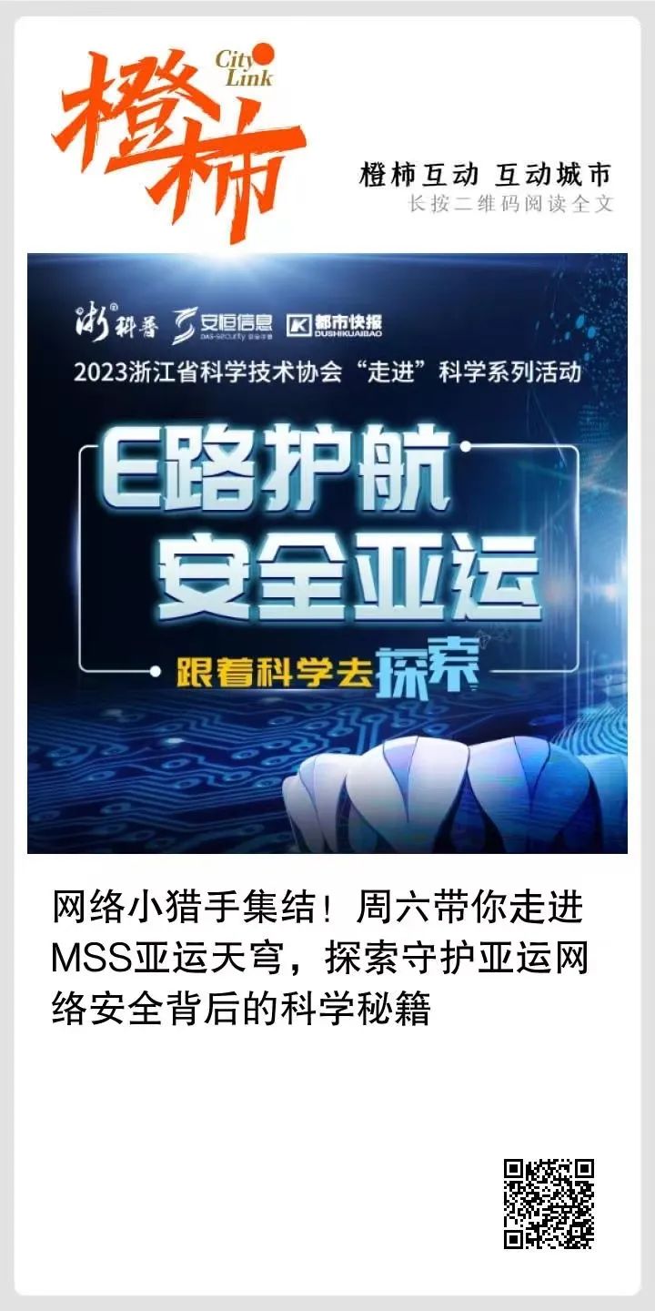這個周六,機會來了!“浙”里網(wǎng)絡(luò)小獵手快快集結(jié)!浙江省科協(xié)聯(lián)合都市快報推出的科學(xué)走進活動,這次將帶領(lǐng)大家走進杭州亞運會官方網(wǎng)絡(luò)安全服務(wù)合作伙伴安恒信息,跟著浙里科普,一起了解“網(wǎng)安神器”,感受“智能亞運”,助力提高全民網(wǎng)絡(luò)安全意識,為數(shù)字中國安全保駕護航。