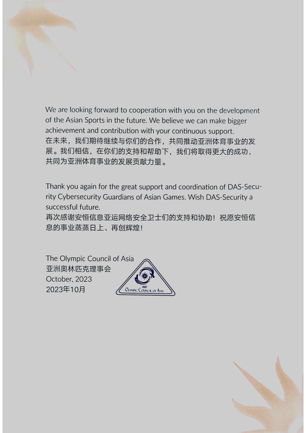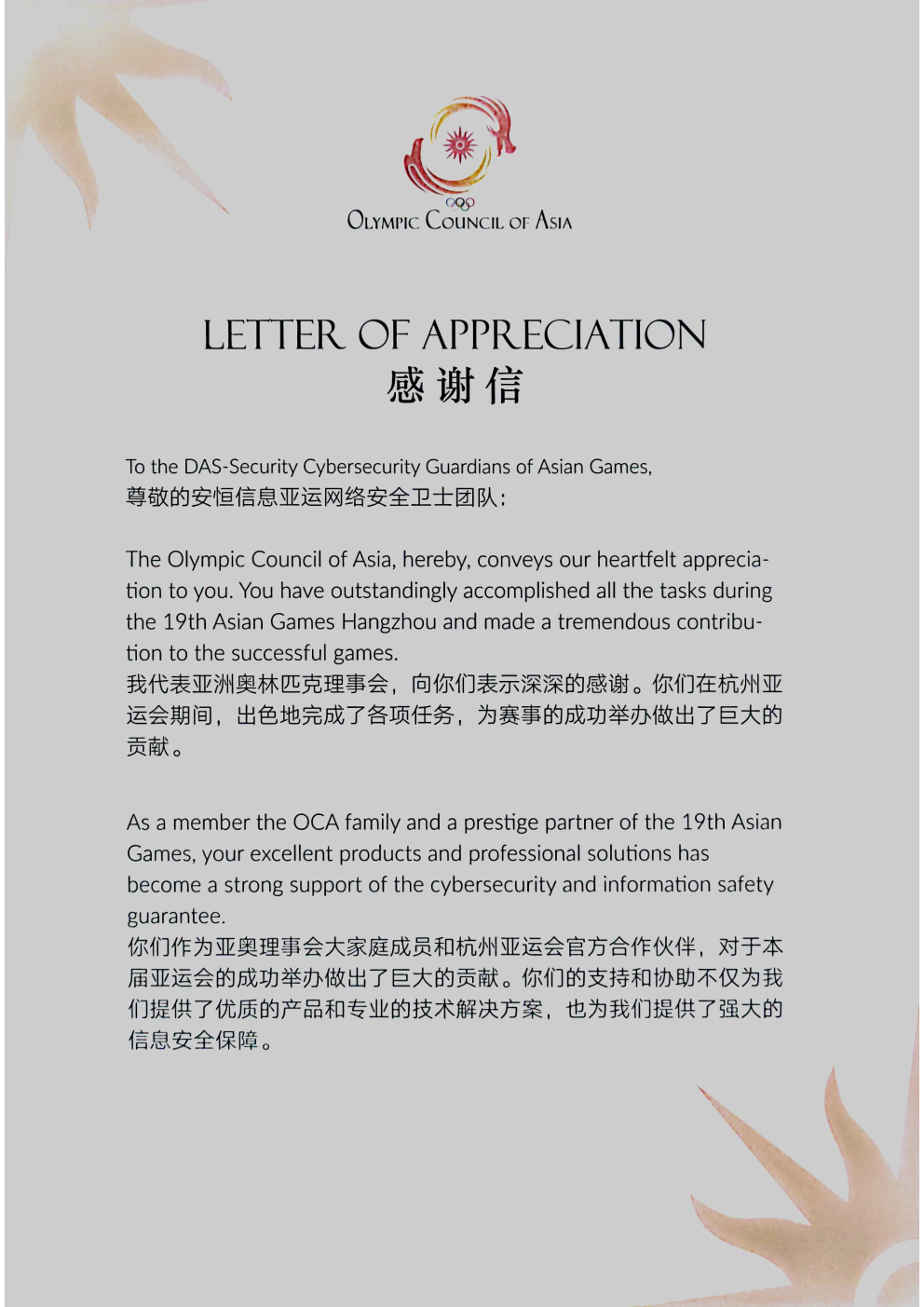 為亞洲體育事業(yè)貢獻力量!安恒信息收獲亞奧理事會感謝信