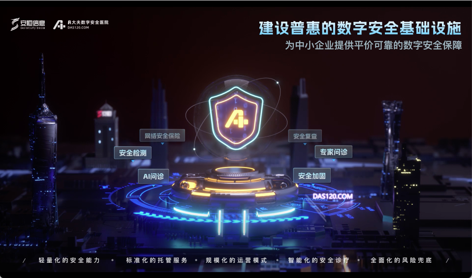 安恒信息云產(chǎn)品線常務(wù)副總裁葉章龍介紹到,“A大夫數(shù)字安全醫(yī)院”是安恒信息針對(duì)中小企業(yè)研發(fā)和建設(shè)的普惠數(shù)字安全基礎(chǔ)設(shè)施。“A大夫”依托安恒AI大模型和SaaS化的安全能力,同時(shí)配合數(shù)字安全保險(xiǎn),降低企業(yè)數(shù)字安全建設(shè)成本,兜底企業(yè)數(shù)字安全風(fēng)險(xiǎn),以“醫(yī)療+醫(yī)?!钡姆绞较蚩蛻籼峁┤芷诘臄?shù)字安全保障。