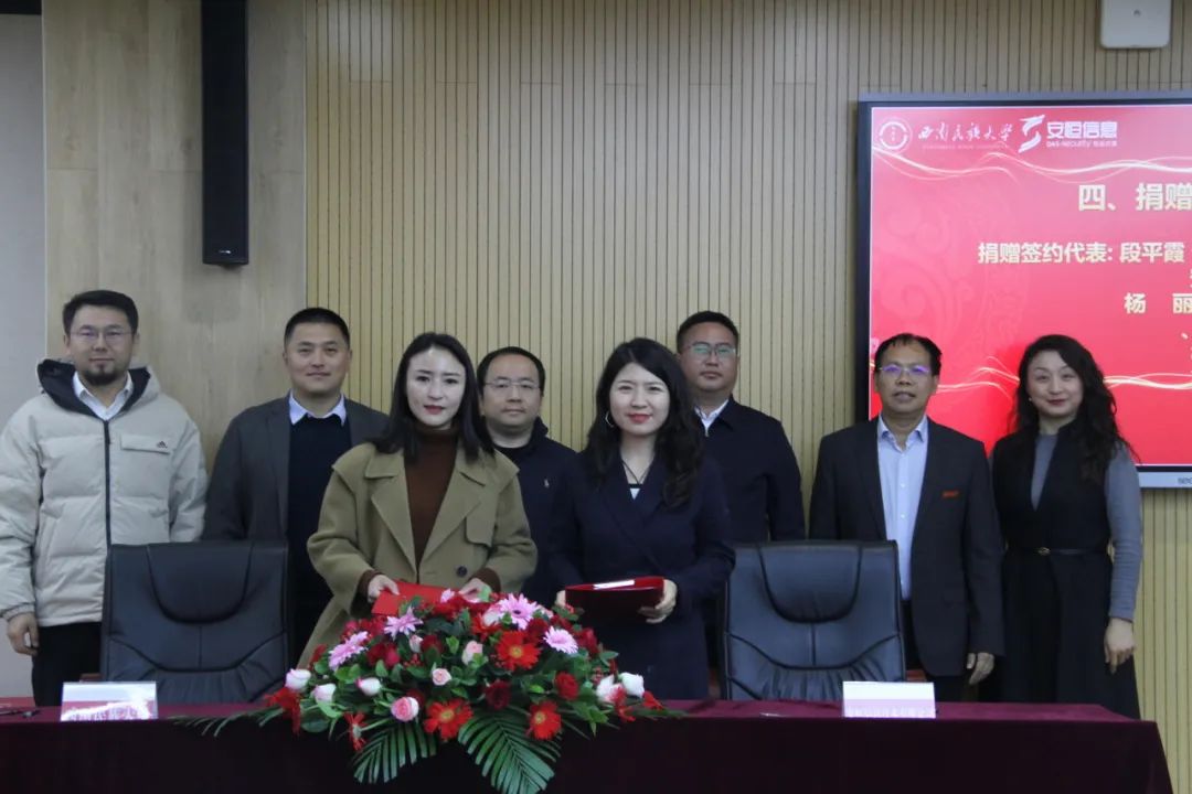 11月14日,西南民族大學(xué)校黨委常委、副校長(zhǎng)爾古打機(jī),計(jì)算機(jī)科學(xué)與工程學(xué)院黨委書(shū)記梁曉軍,計(jì)算機(jī)科學(xué)與工程學(xué)院院長(zhǎng)張建華,計(jì)算機(jī)科學(xué)與工程學(xué)院黨委副書(shū)記施艷麗,國(guó)內(nèi)合作處副處長(zhǎng)楊麗與安恒信息高級(jí)副總裁、成都安恒信息技術(shù)有限公司董事長(zhǎng)吳永越,高級(jí)副總裁、成都市安恒公益慈善基金會(huì)副理事長(zhǎng)段平霞,副總裁、數(shù)字人才創(chuàng)研院副院長(zhǎng)吳鳴旦,副總裁王瑞,副總裁、成都市安恒公益慈善基金會(huì)秘書(shū)長(zhǎng)夏欣然等人出席簽約現(xiàn)場(chǎng),見(jiàn)證授牌。
