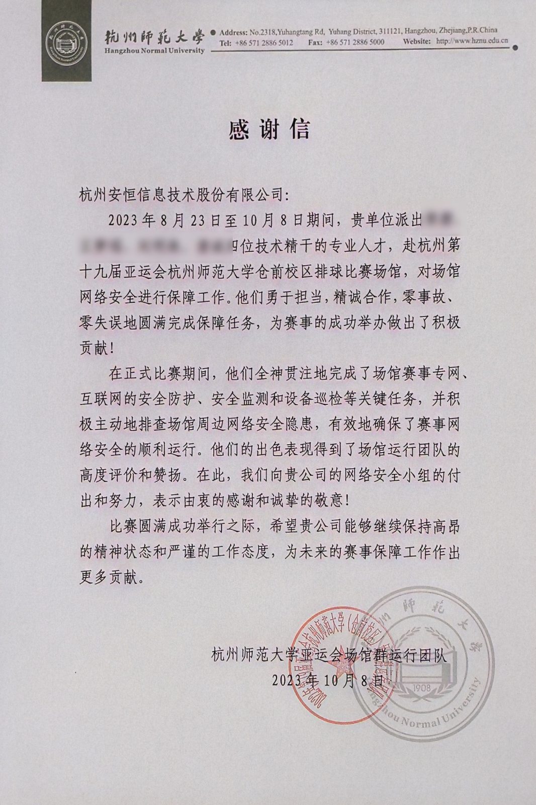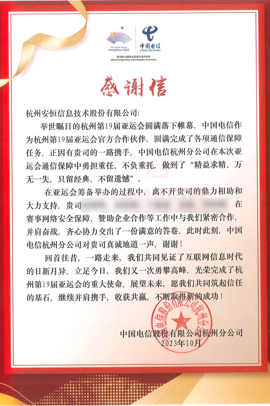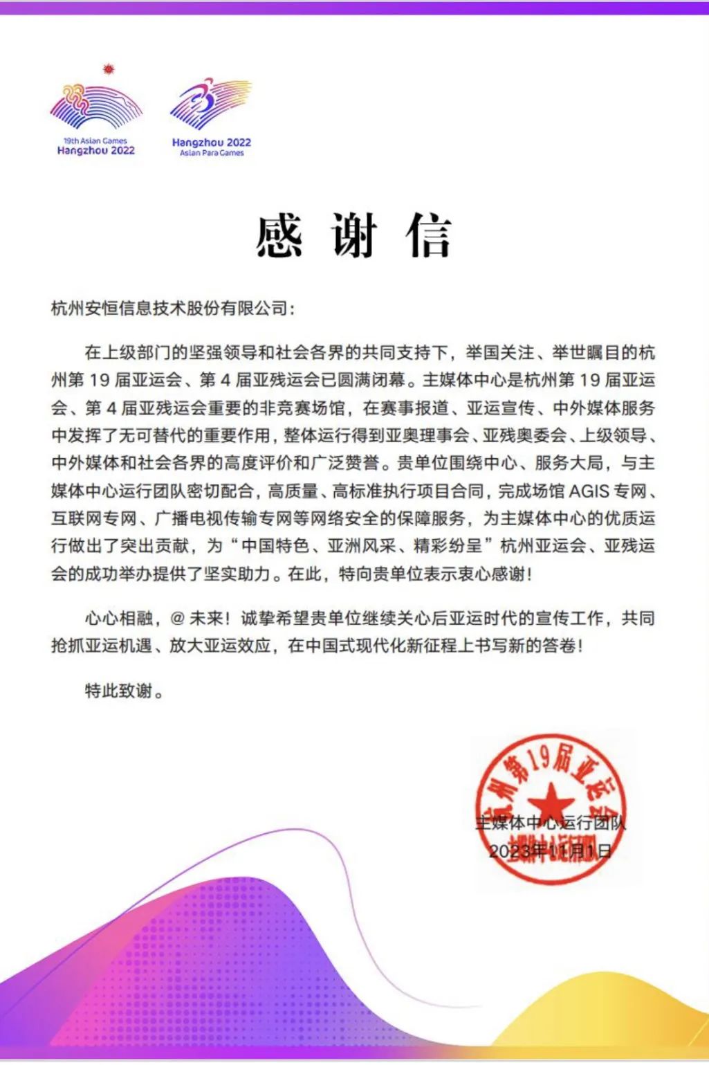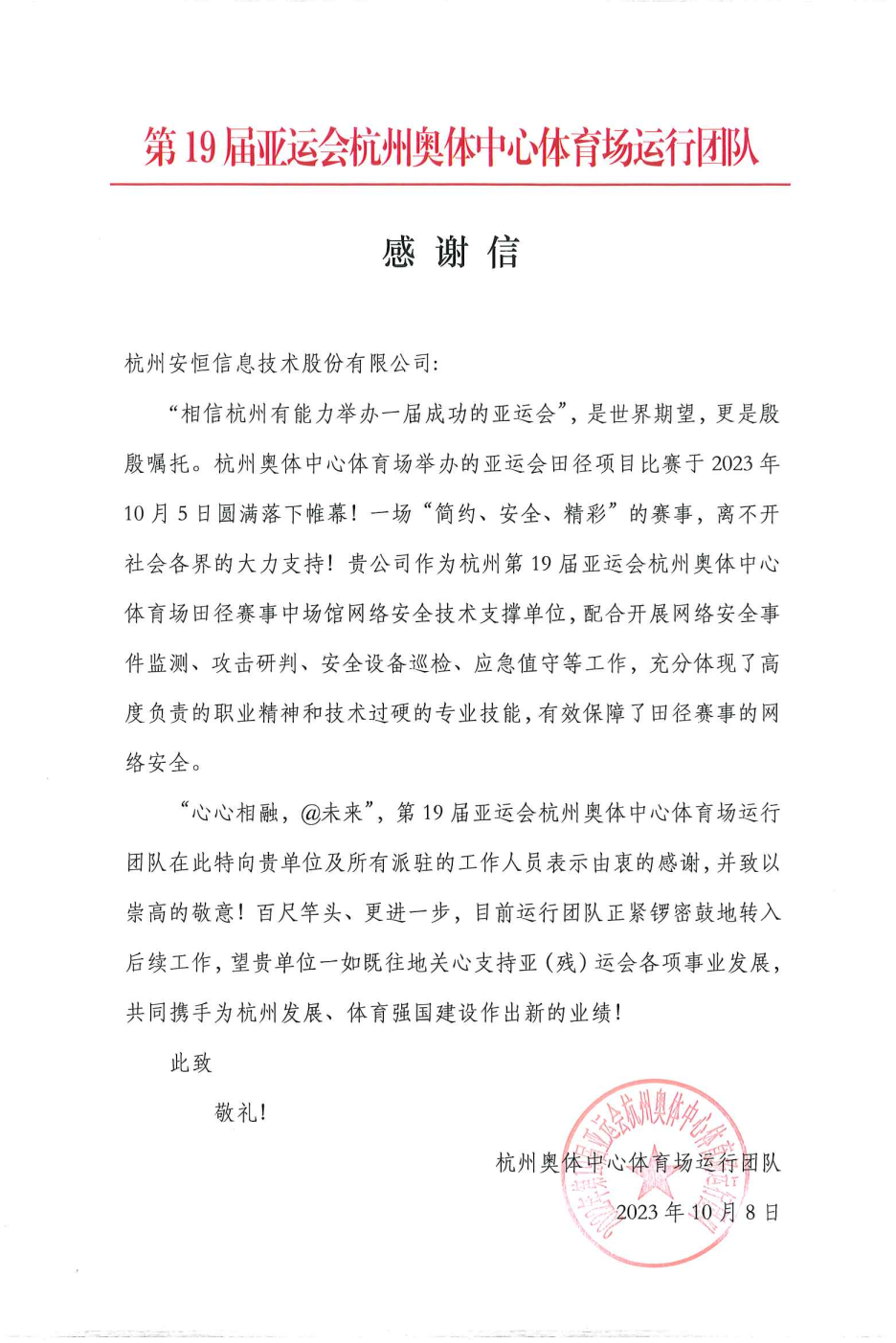 杭州第19屆亞運會組委會、杭州第4屆亞殘運會組委會在感謝信中表示,安恒信息高度重視,以精益求精的態(tài)度、嚴(yán)謹(jǐn)細(xì)致的作風(fēng)、團結(jié)協(xié)作的精神,高質(zhì)量完成各項服務(wù)保障工作,為成功舉辦杭州亞運會、亞殘運會做出了卓越的貢獻(xiàn),必將被永久銘記。