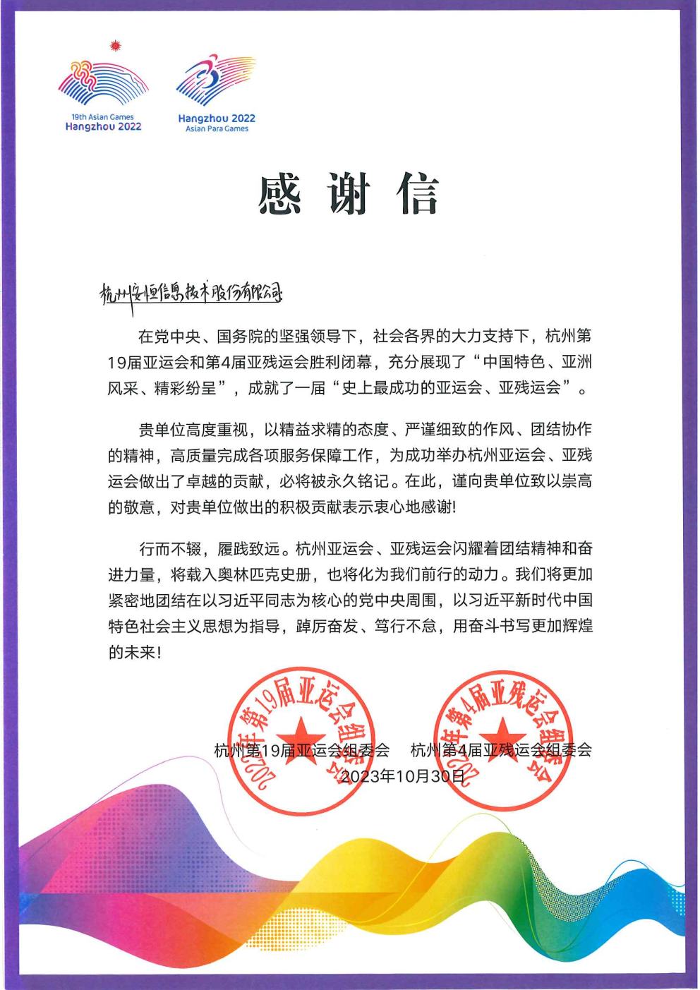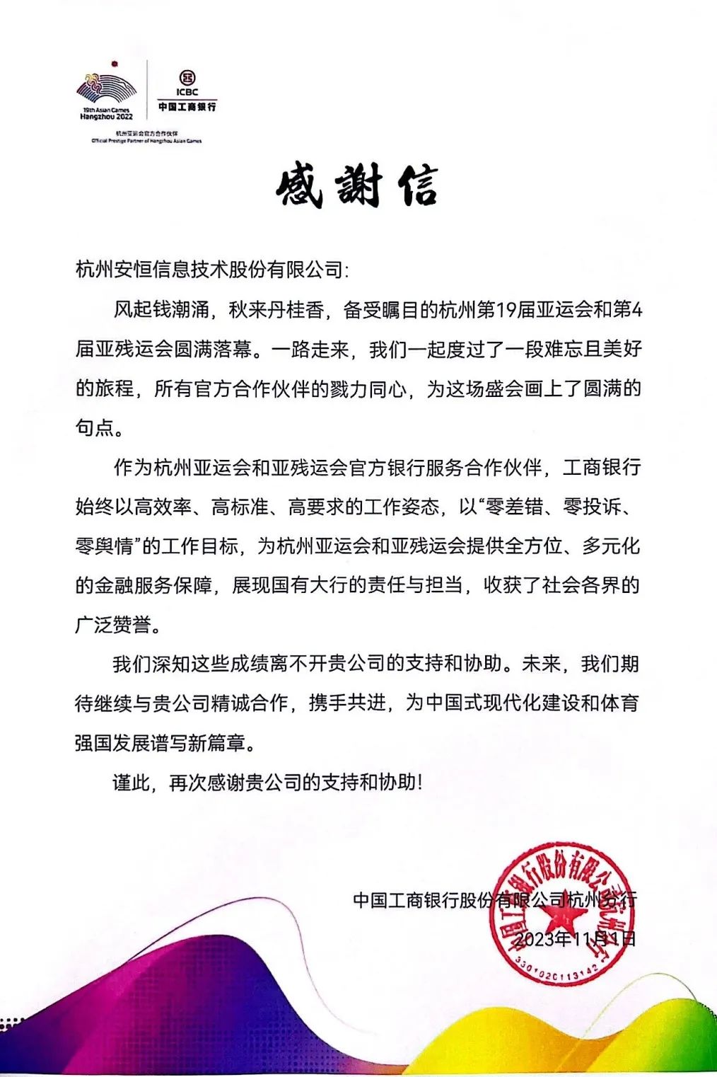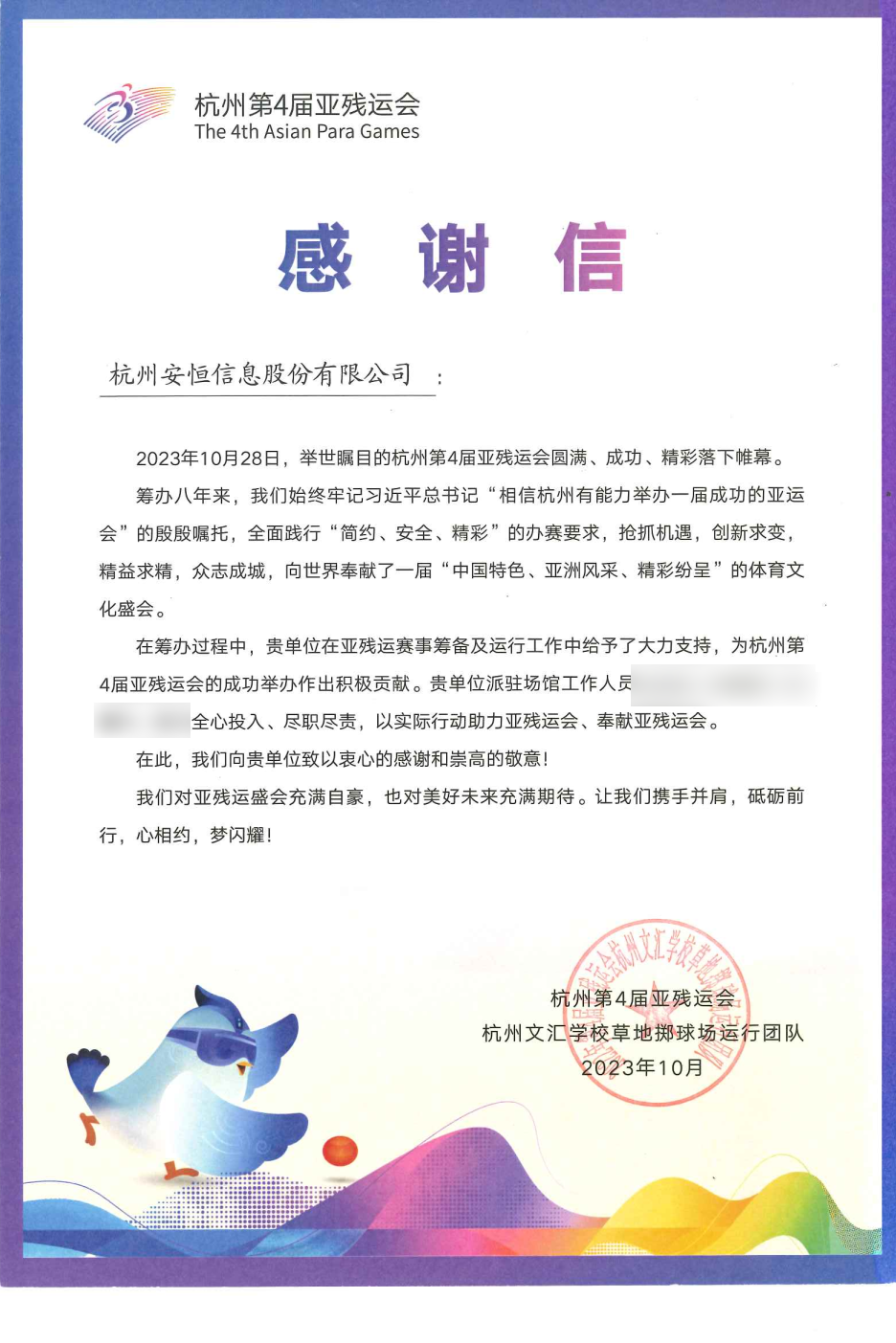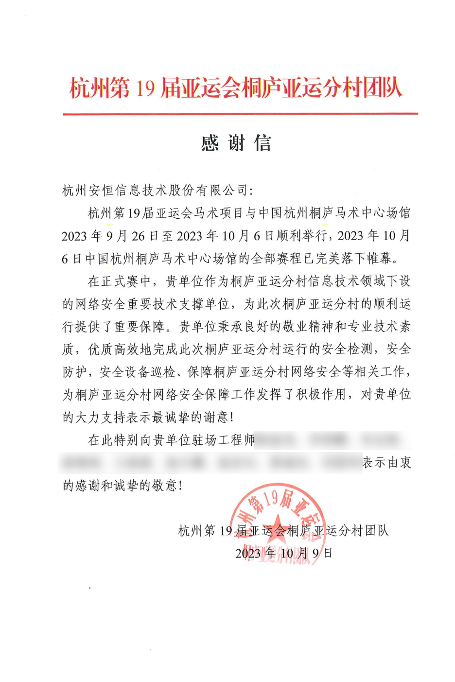 杭州第19屆亞運會組委會、杭州第4屆亞殘運會組委會在感謝信中表示,安恒信息高度重視,以精益求精的態(tài)度、嚴(yán)謹(jǐn)細(xì)致的作風(fēng)、團結(jié)協(xié)作的精神,高質(zhì)量完成各項服務(wù)保障工作,為成功舉辦杭州亞運會、亞殘運會做出了卓越的貢獻(xiàn),必將被永久銘記。