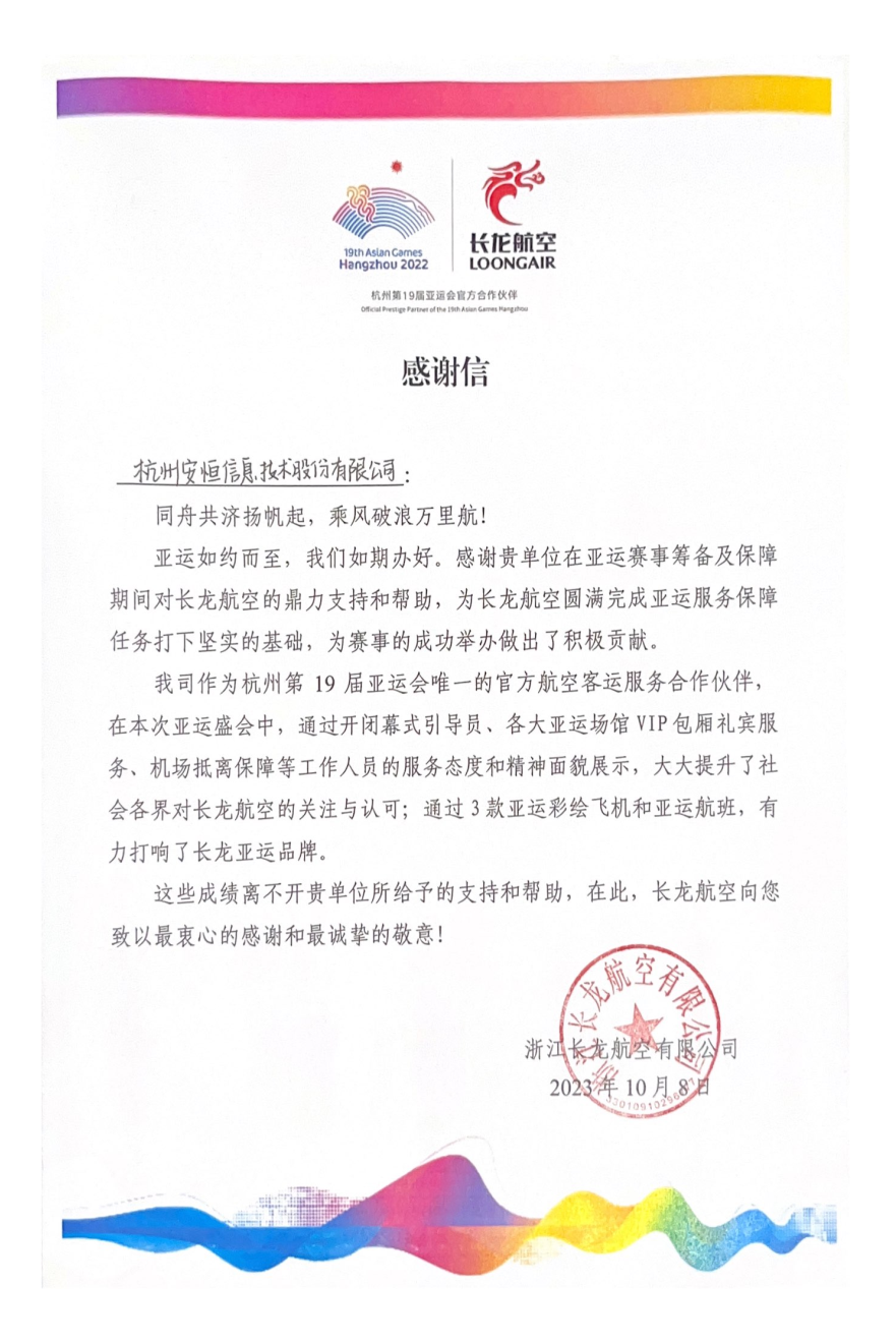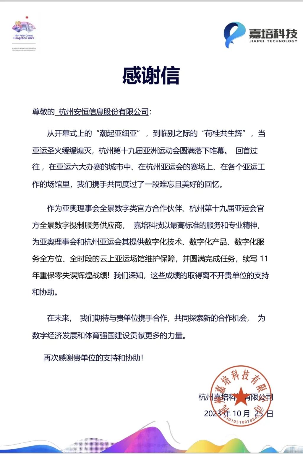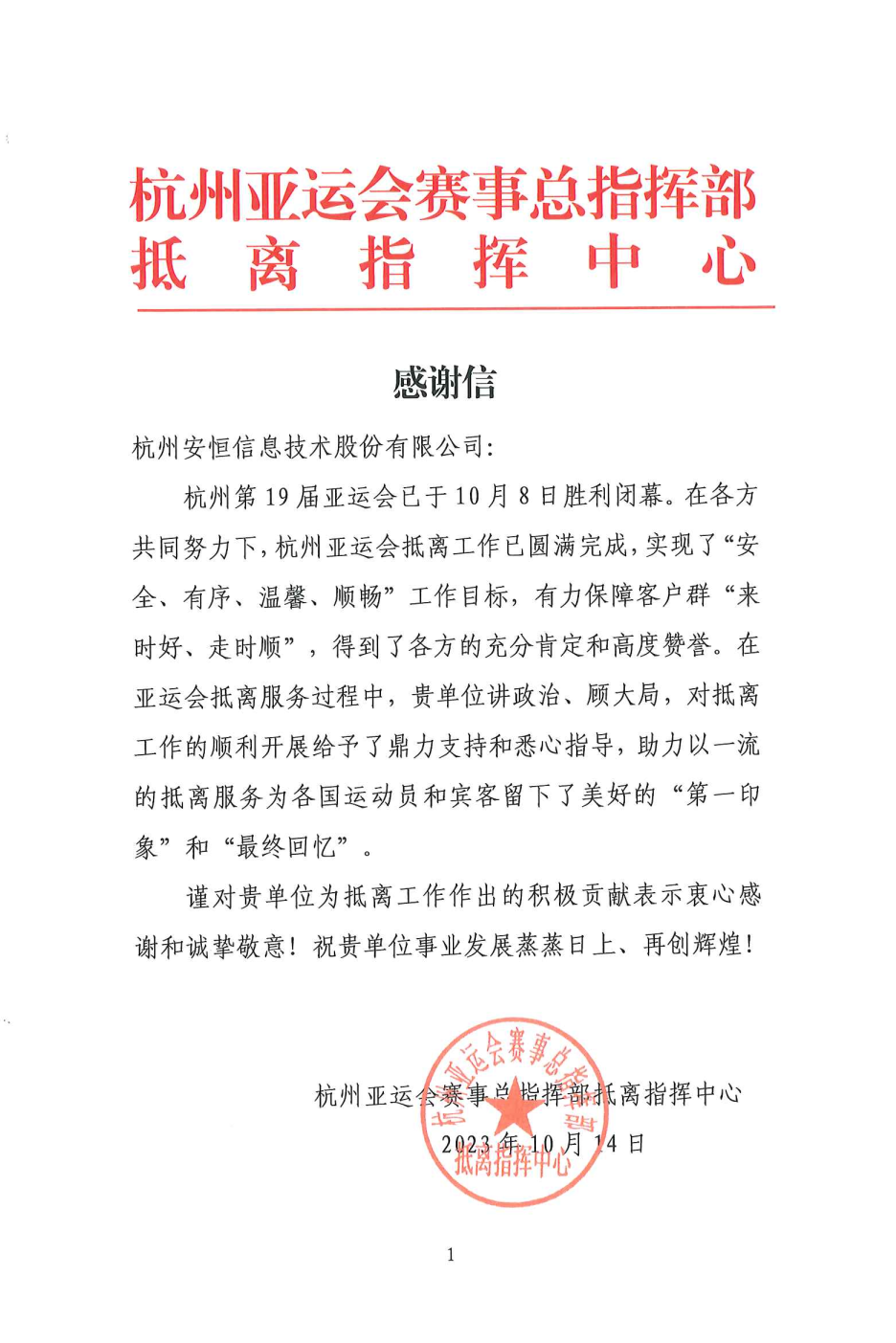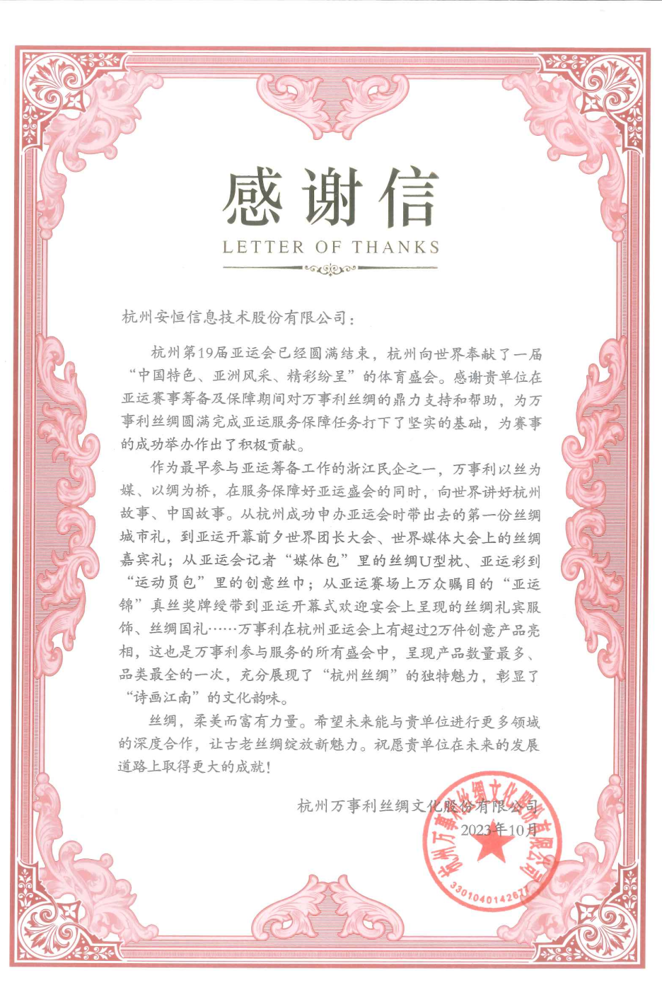 杭州第19屆亞運會組委會、杭州第4屆亞殘運會組委會在感謝信中表示,安恒信息高度重視,以精益求精的態(tài)度、嚴(yán)謹(jǐn)細(xì)致的作風(fēng)、團結(jié)協(xié)作的精神,高質(zhì)量完成各項服務(wù)保障工作,為成功舉辦杭州亞運會、亞殘運會做出了卓越的貢獻(xiàn),必將被永久銘記。