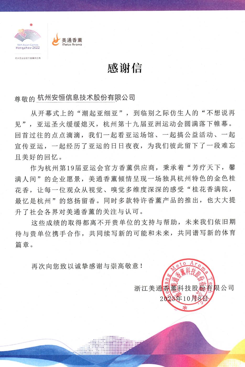 安恒信息也收到了多封來自于杭州亞運會供應(yīng)商、贊助商、合作伙伴的感謝信。在信中,有對安恒信息的肯定與感謝,也有對未來攜手的期待與展望。安恒信息也將與各位伙伴一起,繼續(xù)并肩、共進(jìn),譜寫新的篇章。