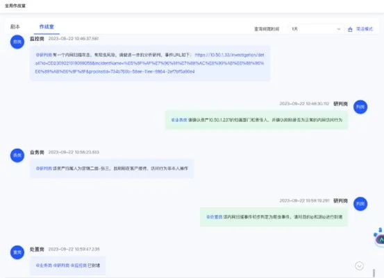 提供實時的交流協(xié)作線上平臺,應(yīng)急事件發(fā)生時一鍵拉起協(xié)同應(yīng)急作戰(zhàn)室,三線安全運營專家快速接入平臺,實現(xiàn)安全事件快速響應(yīng)、高效協(xié)同,同時一鍵生成事件處置報告,方便事后回溯、分析、橫展等工作的開展。