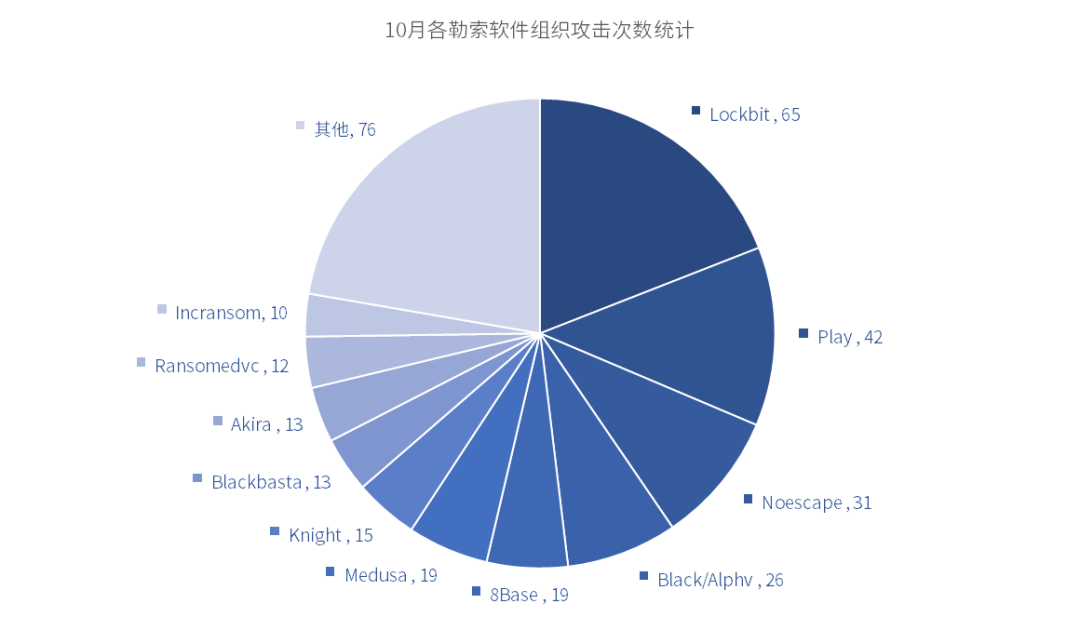 安恒信息獵影實驗室跟蹤全球勒索軟件組織發(fā)現(xiàn),勒索軟件攻擊威脅已經(jīng)進入“高頻”的新常態(tài)當(dāng)中,連續(xù)8個月月均披露300余起。10月,全球公開披露的勒索事件就多達340余起,與去年同期相比,增幅達50%以上。