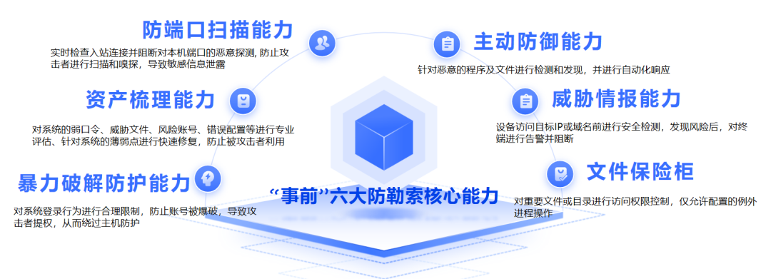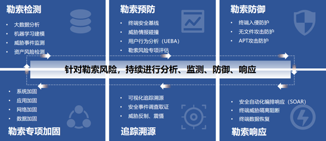 安恒EDR認(rèn)為為應(yīng)對勒索風(fēng)險,需要覆蓋事前加固和防御、事中持續(xù)動態(tài)分析和檢測、事后快速處置響應(yīng)和溯源等多個階段進行安全防范,全方位應(yīng)對勒索病毒攻擊風(fēng)險。