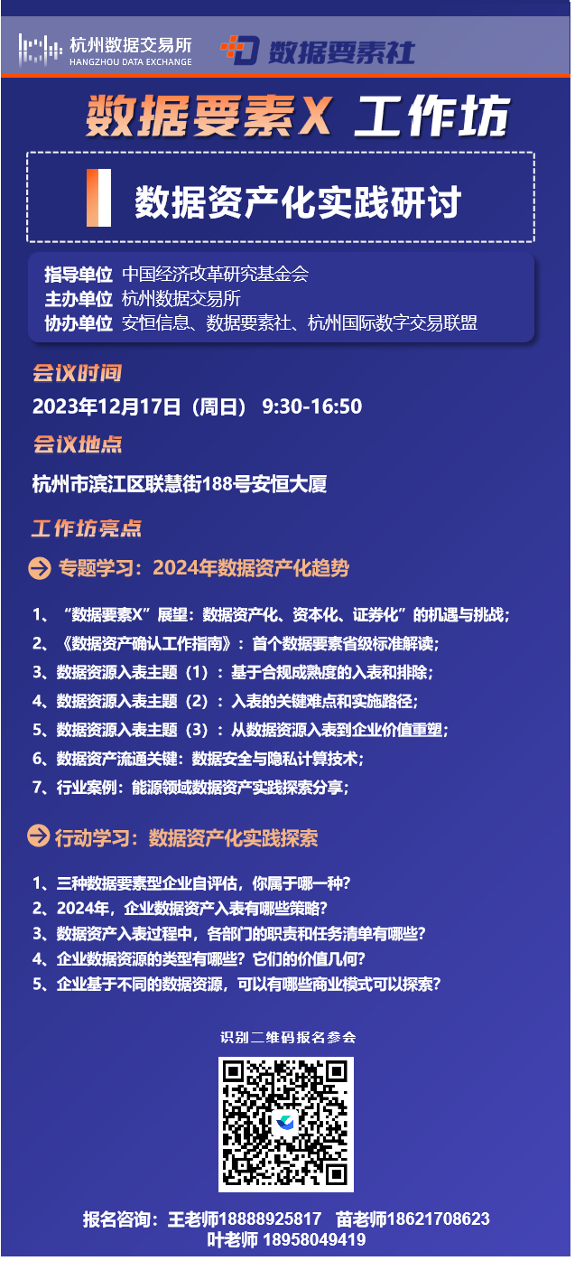 限量報(bào)名!“數(shù)據(jù)要素X”工作坊杭州站—數(shù)據(jù)資產(chǎn)化實(shí)踐研討