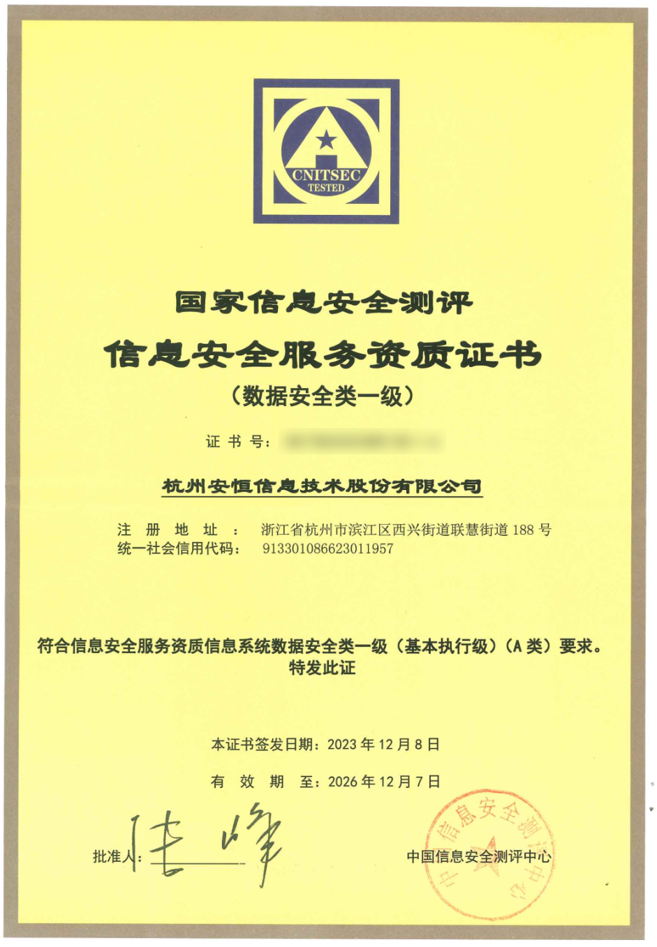 首批獲證!安恒信息獲得國家信息安全服務數(shù)據(jù)安全類一級資質(zhì)