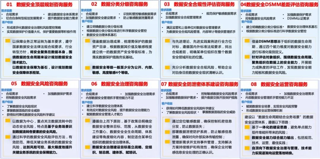 數(shù)據(jù)安全咨詢服務體系自發(fā)布以來旨在深度參與客戶數(shù)據(jù)安全體系規(guī)劃、建設落地到運營的全過程,持續(xù)提升數(shù)據(jù)安全能力成熟度水平,其完整的主線可以概括成“設目標、定框架、數(shù)分類、數(shù)分級、看現(xiàn)狀、識風險、立制度、設策略、制架構、落能力、融流程、驗效果”,可提供的核心服務包括八大類:數(shù)據(jù)安全頂層規(guī)劃、分類分級、合規(guī)評估、DSMM差距評估、風險評估、治理咨詢、防泄密體系、運營體系設計咨詢服務。