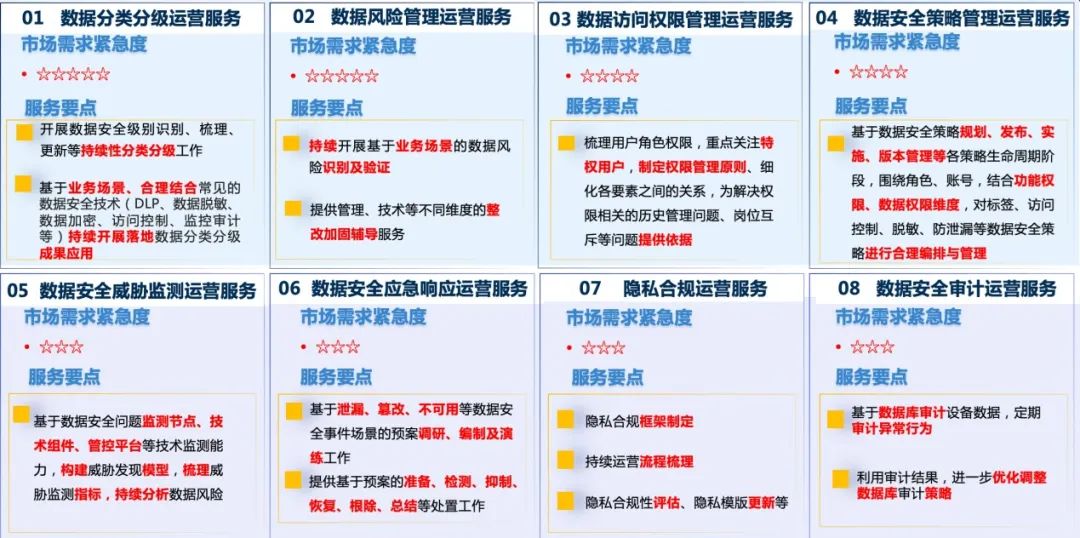 數(shù)據(jù)安全運營服務經(jīng)客戶實際需求收益、行業(yè)技術發(fā)展趨勢研究發(fā)現(xiàn)為重要且緊急的需求,故數(shù)據(jù)安全服務團隊聯(lián)動“數(shù)盾”全系列產(chǎn)品團隊協(xié)同研究開發(fā),基于不同運營場景,推出八個細項服務:數(shù)據(jù)安全分類分級運營、風險管理、訪問權限管理、策略管理、威脅監(jiān)測、應急響應、隱私合規(guī)、及審計運營服務,不斷夯實數(shù)據(jù)安全八大核心服務基座,逐步形成安恒信息數(shù)據(jù)安全服務全景圖。