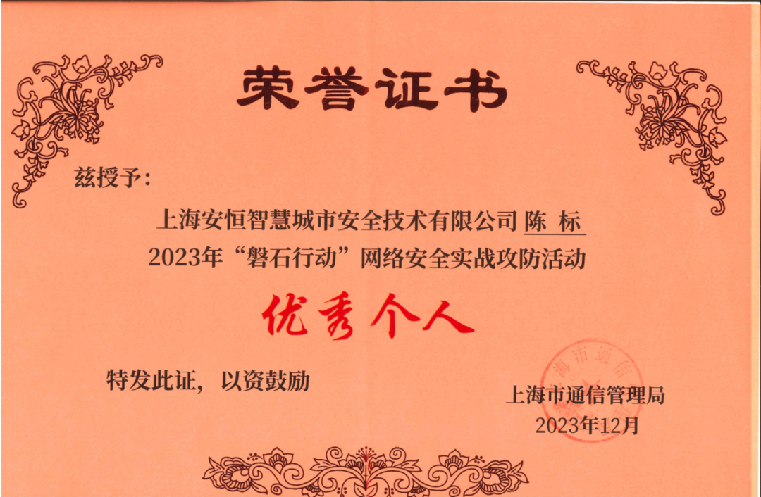此外,安恒信息安全服務(wù)專(zhuān)家陳標(biāo)憑借出色的個(gè)人表現(xiàn),榮獲了磐石行動(dòng)優(yōu)秀個(gè)人獎(jiǎng)。陳標(biāo)的專(zhuān)業(yè)知識(shí)和技能素養(yǎng)在活動(dòng)中得到了充分展現(xiàn)。